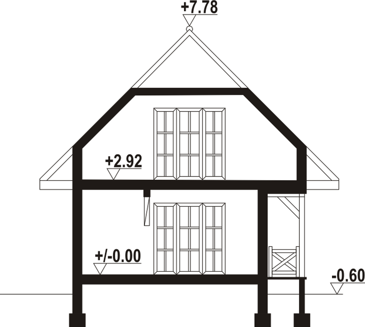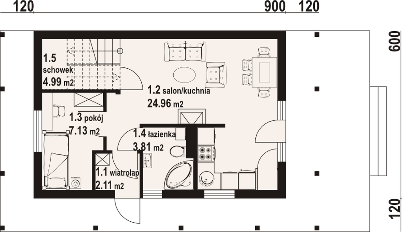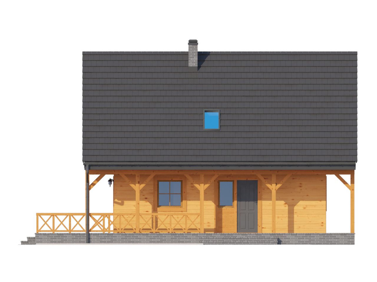 Dom w konstrukcji szkieletu drewnianego. Duży salon z aneksem kuchennym, kominkiem, schodami na poddasze i wyjściem na zadaszony taras. Pokój, łazienka, wiatrołap. Na poddaszu dwa pokoje, łazienka, garderoba, komunikacja i dwa balkony. Zwarta bryła budynki i dach dwuspadowy sprzyjają szybkiej i taniej budowie i niskim kosztom eksploatacji.