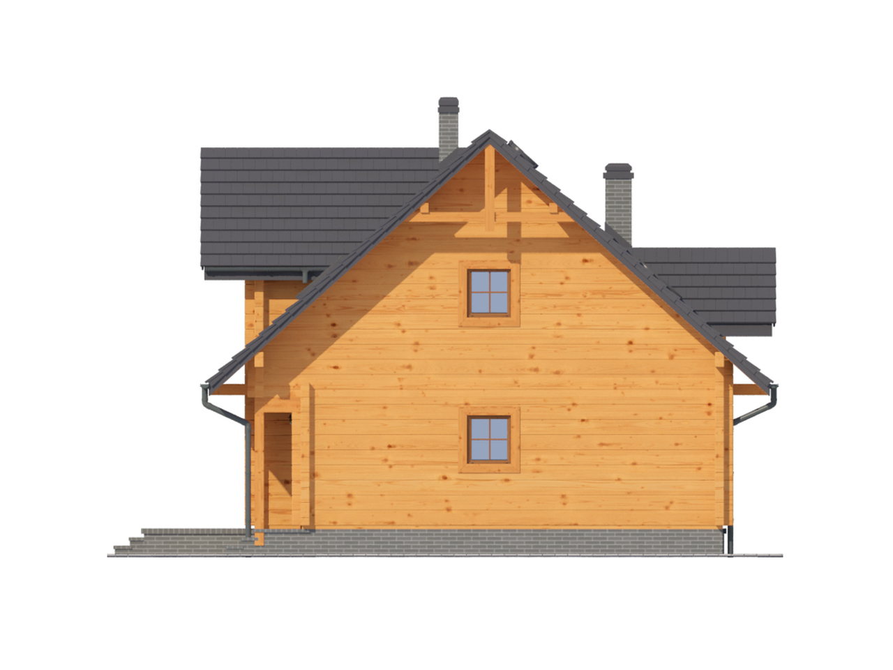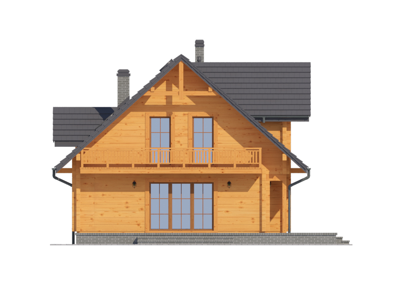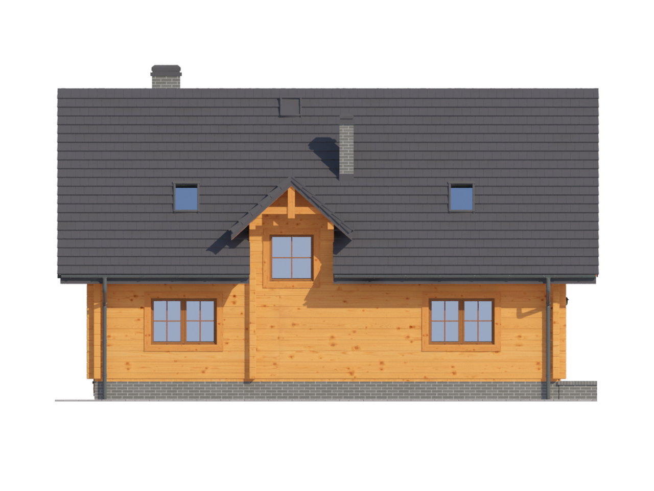Dom z bali drewnianych. Duży salon z kominkiem, wyjściami na taras i schodami na poddasze, kuchnia, pokój, kotłownia, wiatrołap i korytarz. Na poddaszu trzy pokoje, łazienka, komunikacja i balkon. Zwarta bryła budynki i dach dwuspadowy sprzyjają łatwej i szybkiej budowie i niskim kosztom eksploatacji.