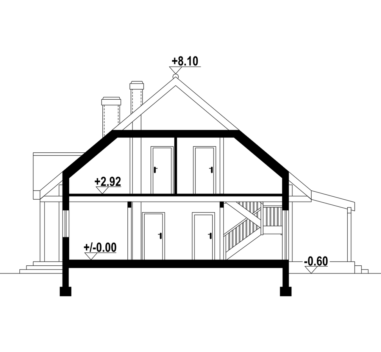 Dom z bali drewnianych. Duży salon z aneksem kuchennym, kominkiem, schodami na poddasze i wyjściem na zadaszony taras. Pokój, łazienka, kotłownia, wiatrołap. Na poddaszu cztery pokoje, łazienka i komunikacja. Zwarta bryła budynku i dach dwuspadowy sprzyjają szybkiej i taniej budowie i niskim kosztom eksploatacji.
