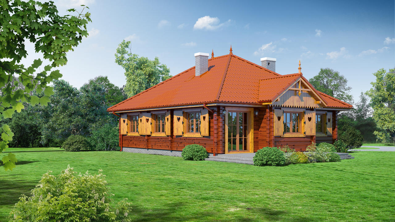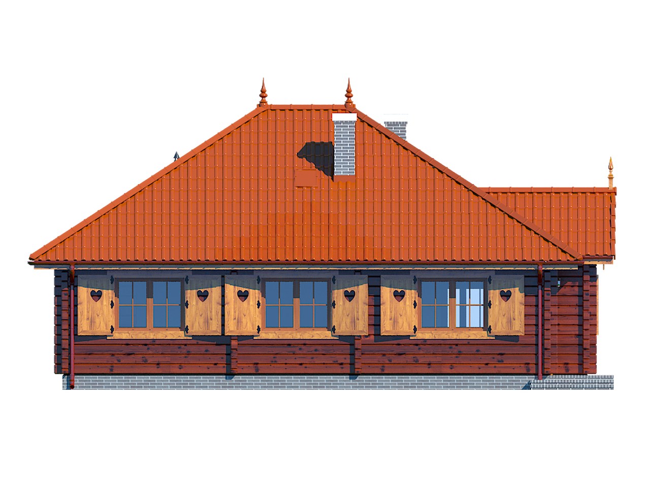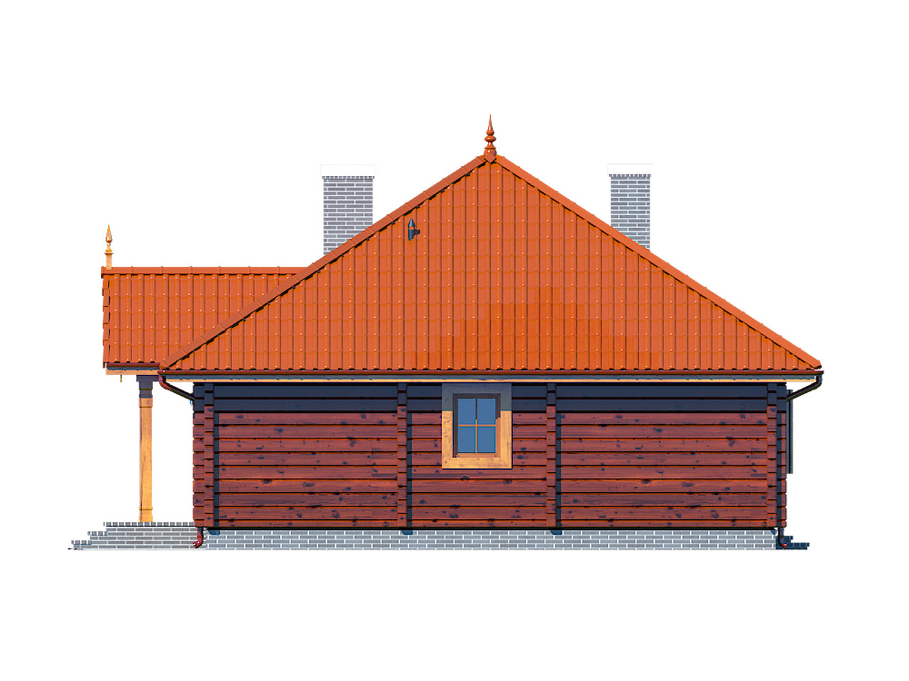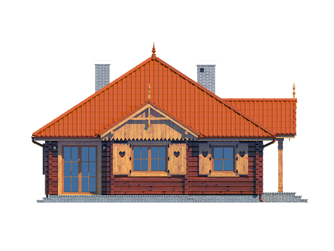 Nieduży, funkcjonalny dom parterowy. Salon z wykuszem, trzy pokoje i łazienka. Wydzielona kuchnia i kotłownia. Kominek w salonie. Schody na strych prowadzą z wiatrołapu.