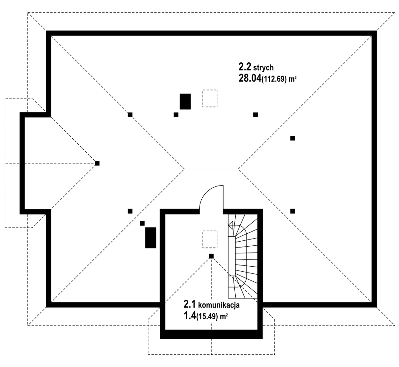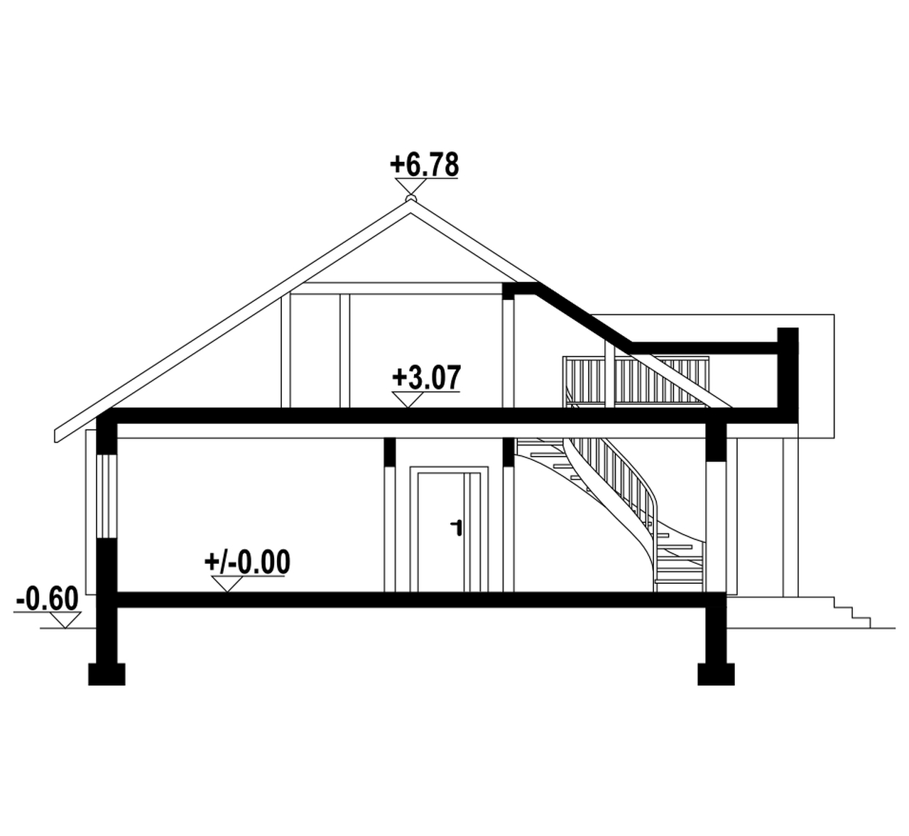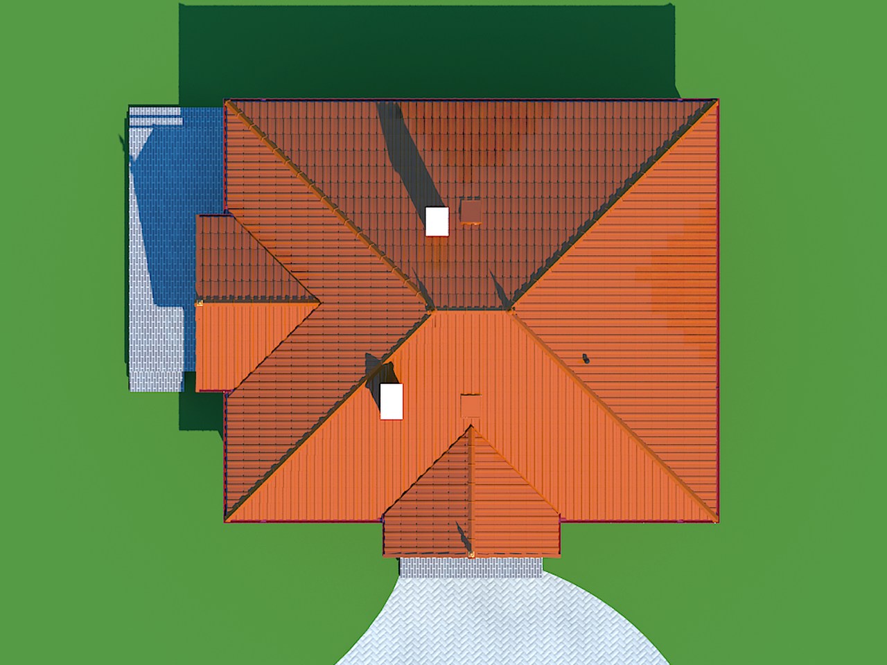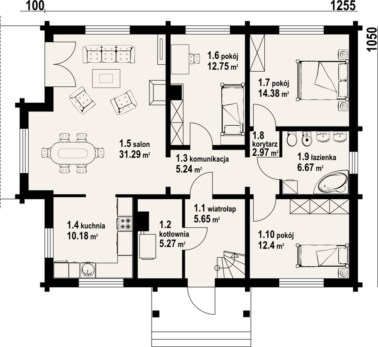Nieduży, funkcjonalny dom parterowy. Salon z wykuszem, trzy pokoje i łazienka. Wydzielona kuchnia i kotłownia. Kominek w salonie. Schody na strych prowadzą z wiatrołapu.