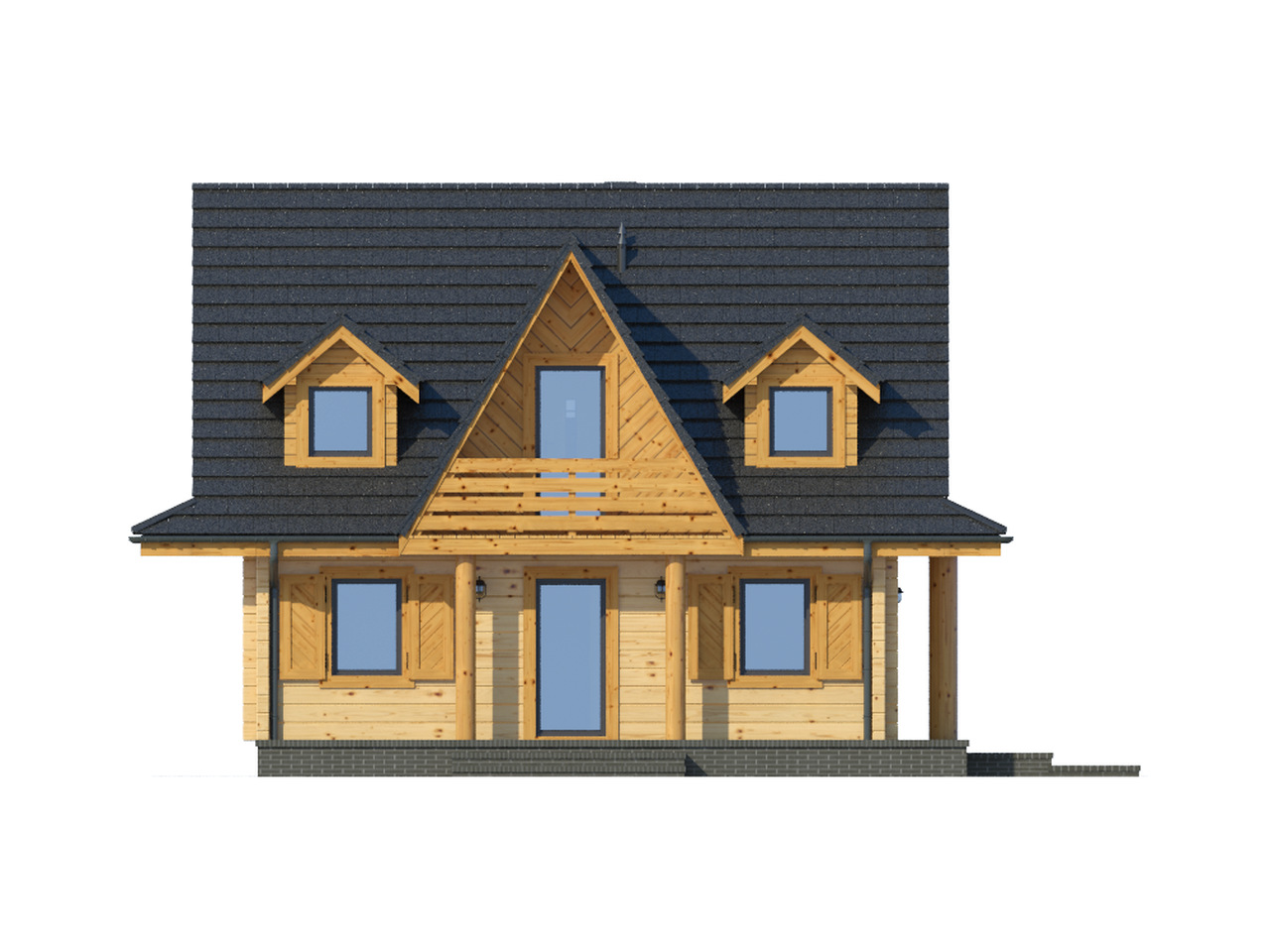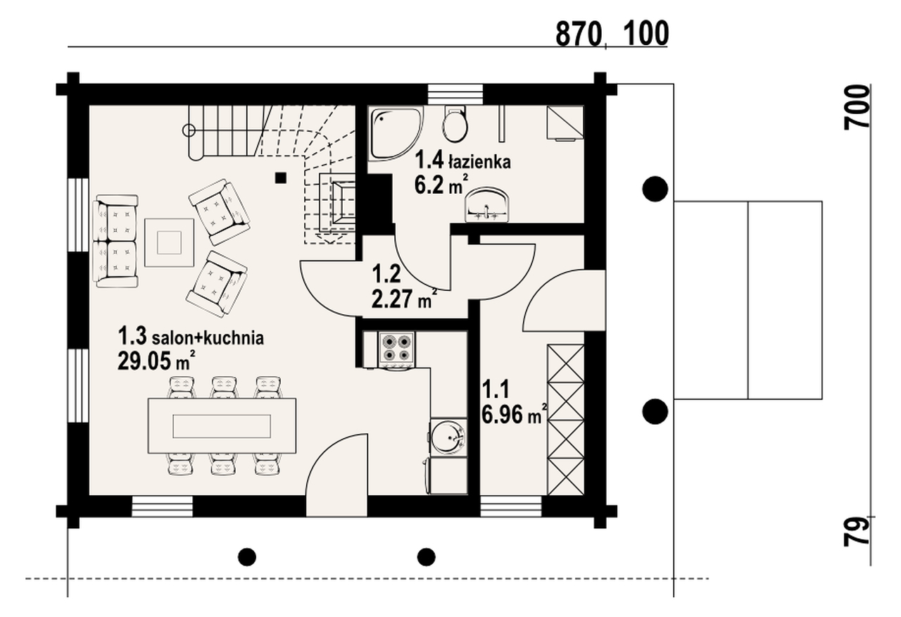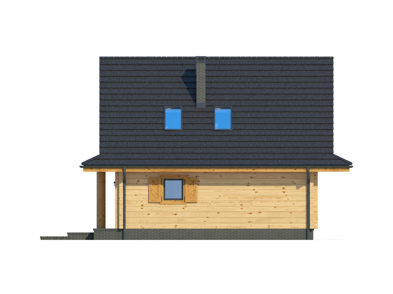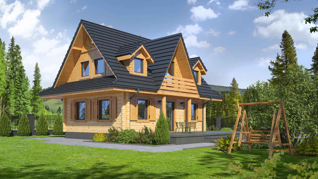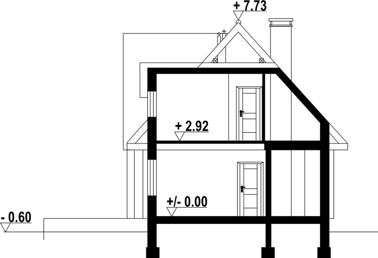 Nieduży, ekonomiczny dom z poddaszem, nadający się do usytuowania na wąskiej działce. Na parterze zaprojektowano salon z aneksem kuchennym oraz łazienkę. W salonie kominek i usytuowane w narożu schody prowadzące na poddasze. Tam strefa nocna z trzema sypialniami i łazienką.
