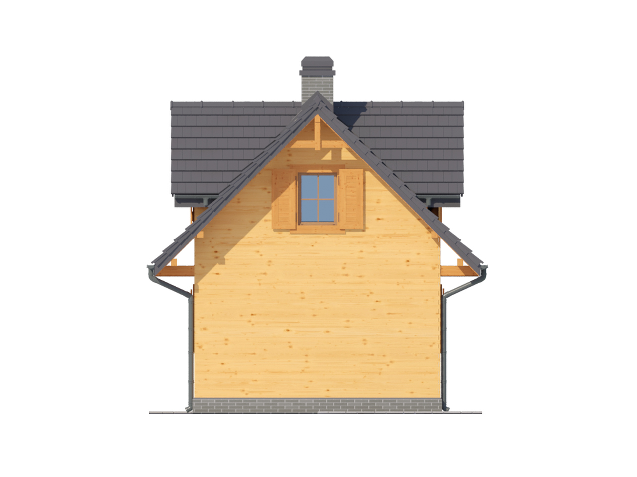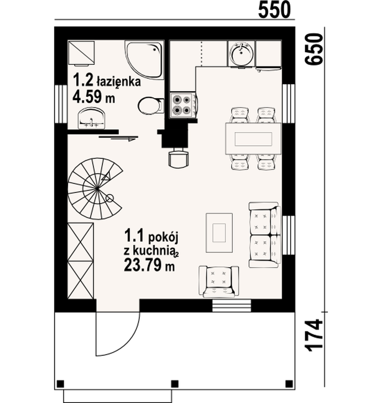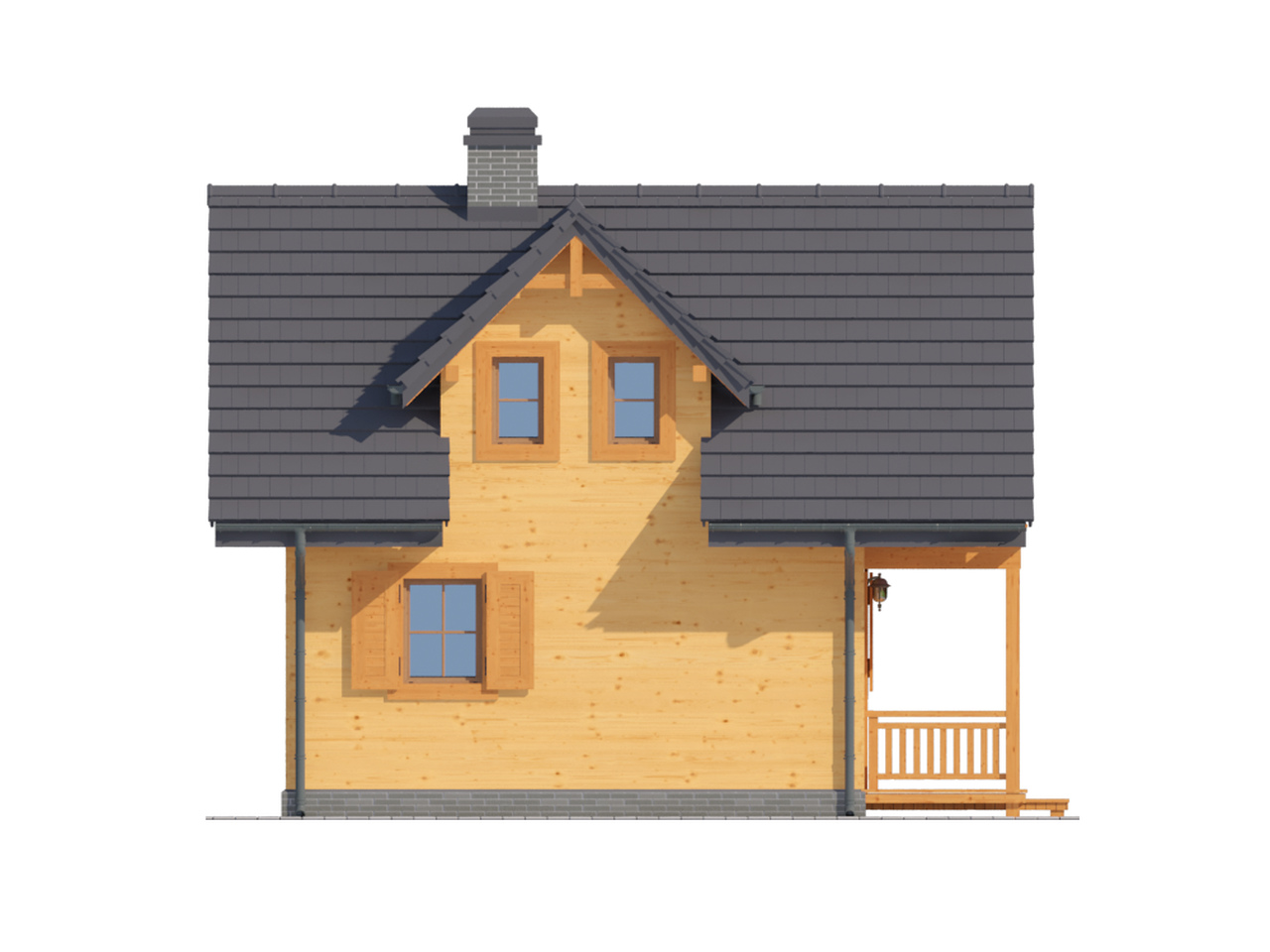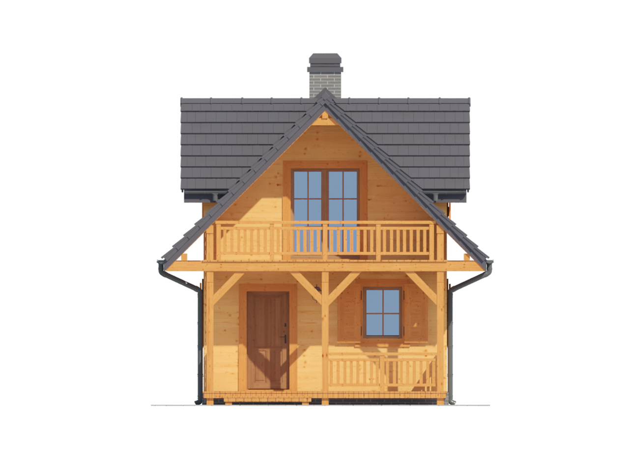 Mały letniskowy dom w konstrukcji szkieletu drewnianego. Na parterze pokój z aneksem kuchennym, łazienką i schodami na poddasze. Na poddaszu sypialnia z dostępnym balkonem oraz wc.