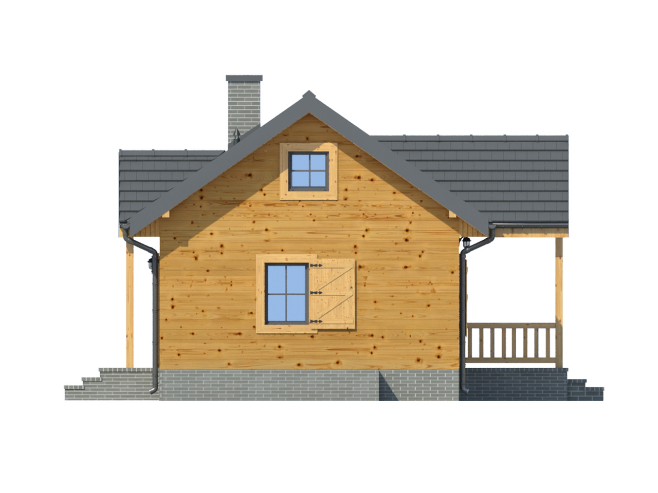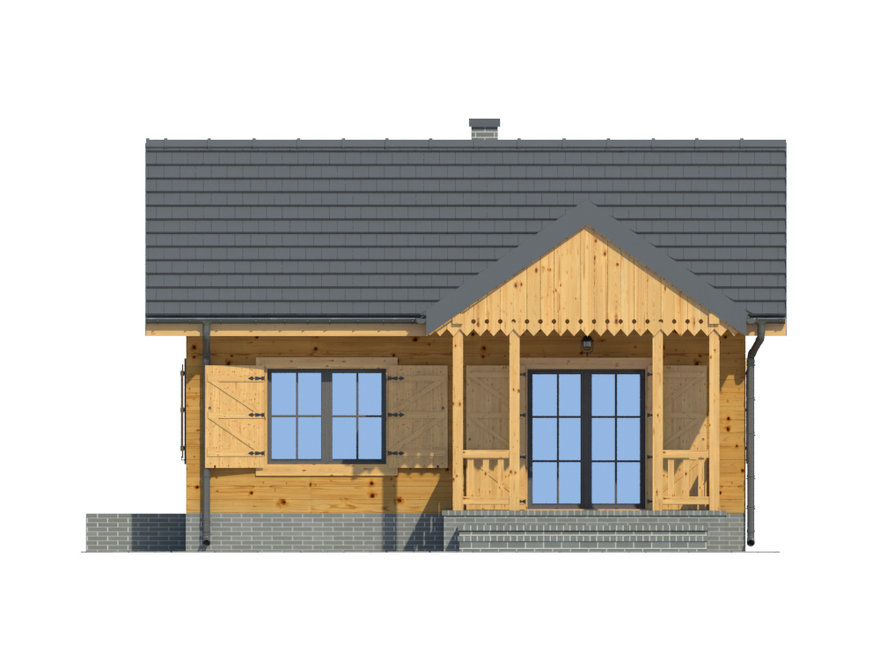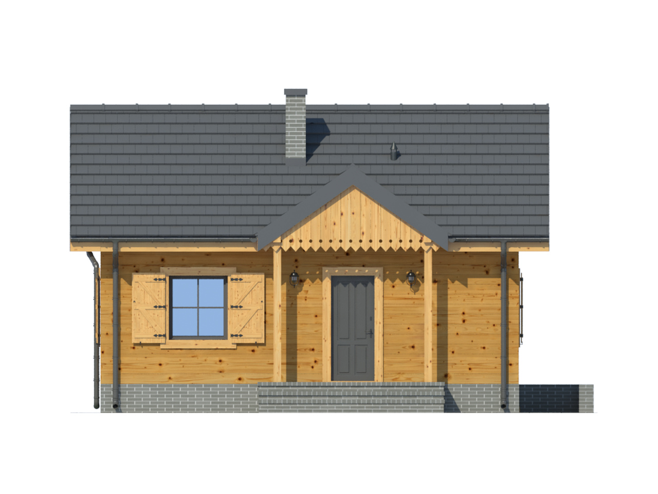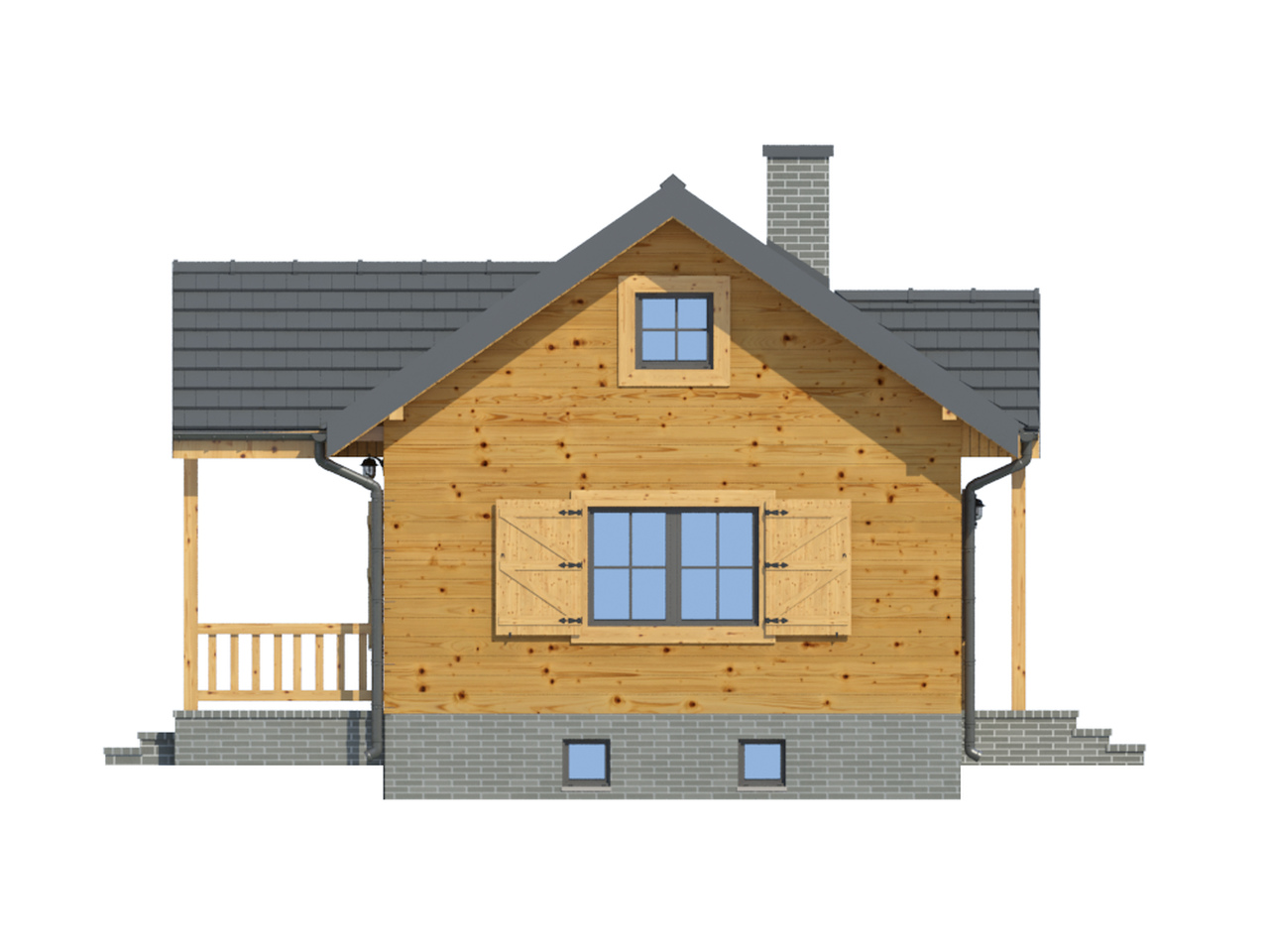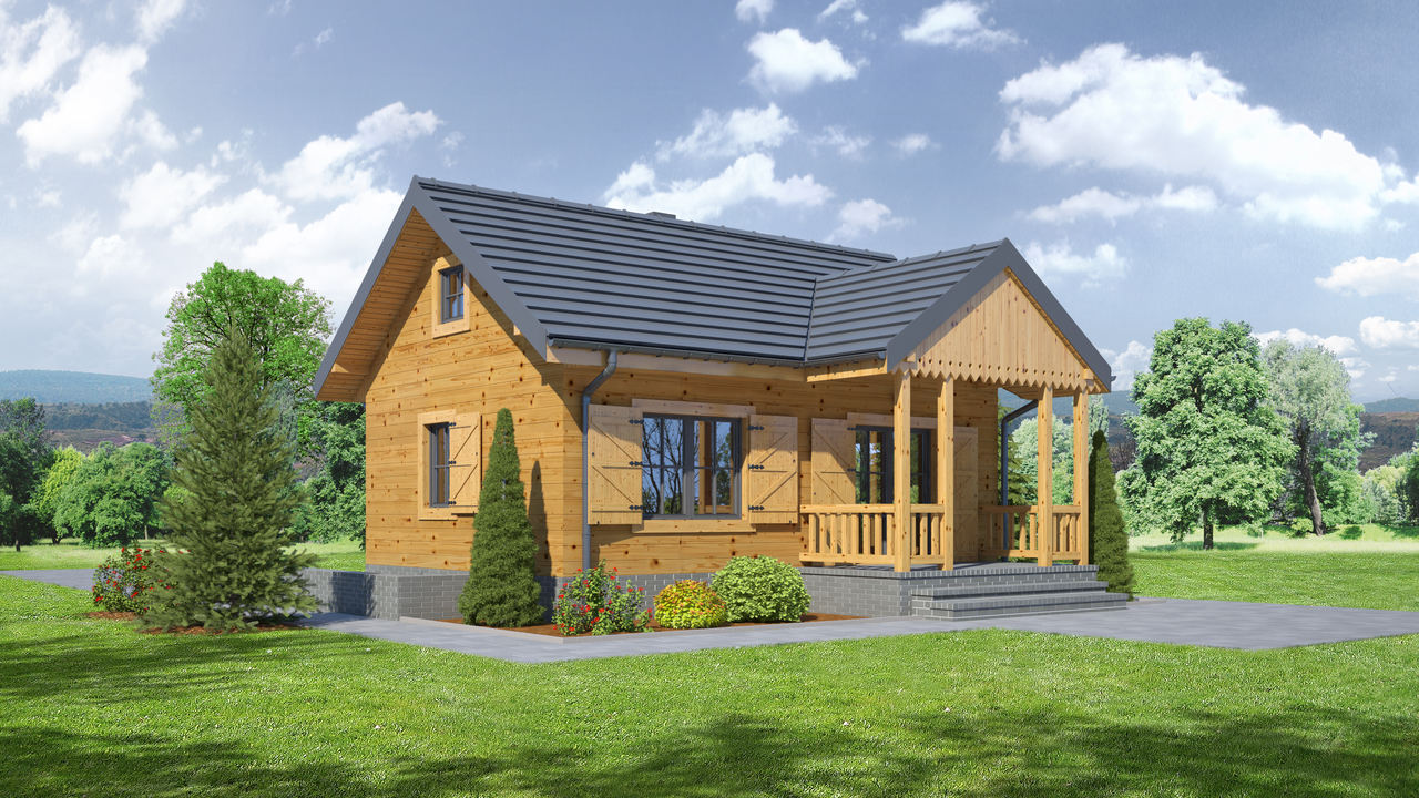 Mały dom w konstrukcji szkieletu drewnianego. Wiatrołap z miejscem na szafę. Salon z aneksem kuchennym, kominkiem i wyjściem na taras. Taras zadaszony. Pokój, łazienka.Podpiwniczenie dostępne schodami na zewnątrz domu. Zwarta bryła budynku i dach dwuspadowy sprzyjają taniej i szybkiej budowie i niskim kosztom eksploatacji.