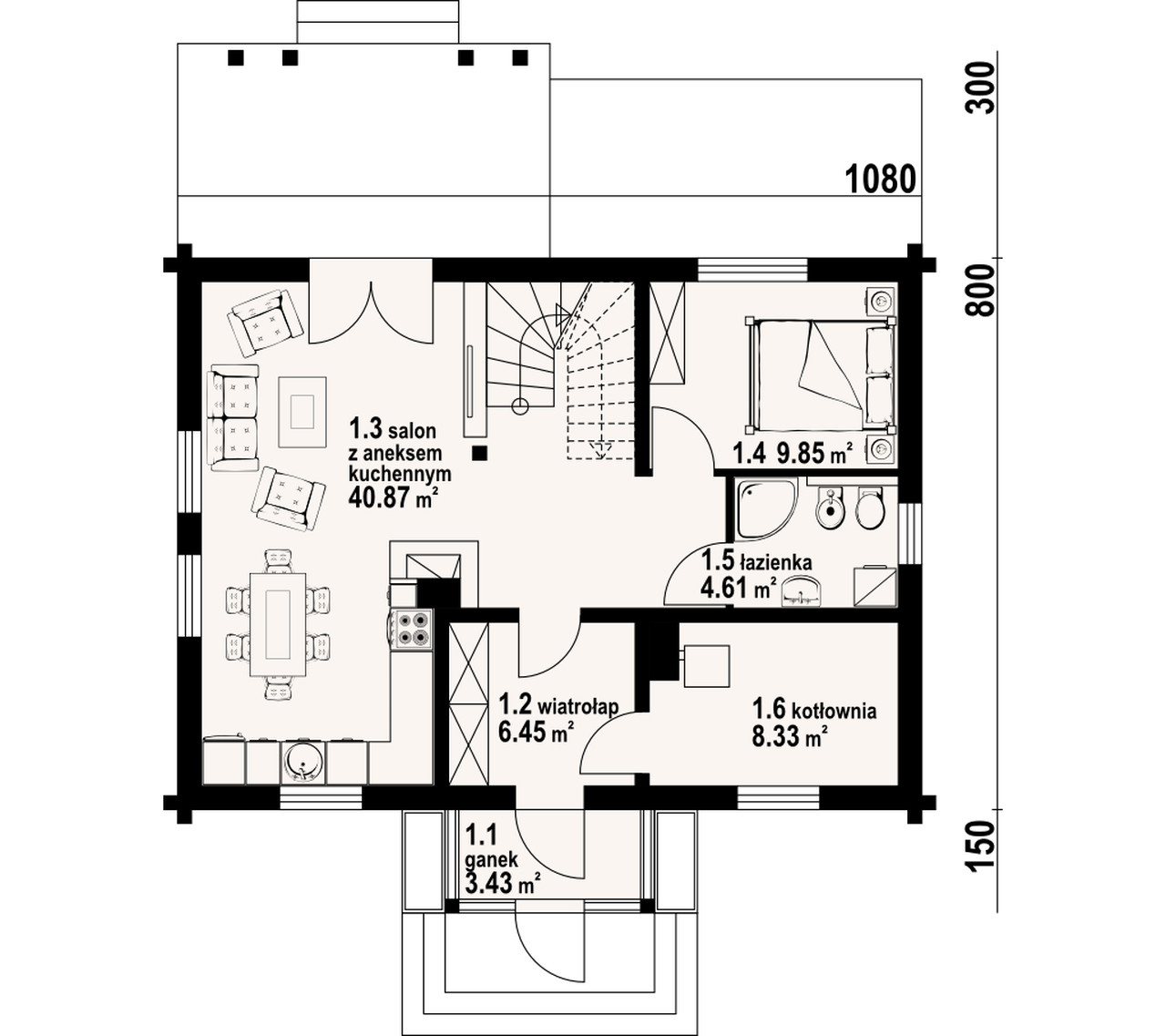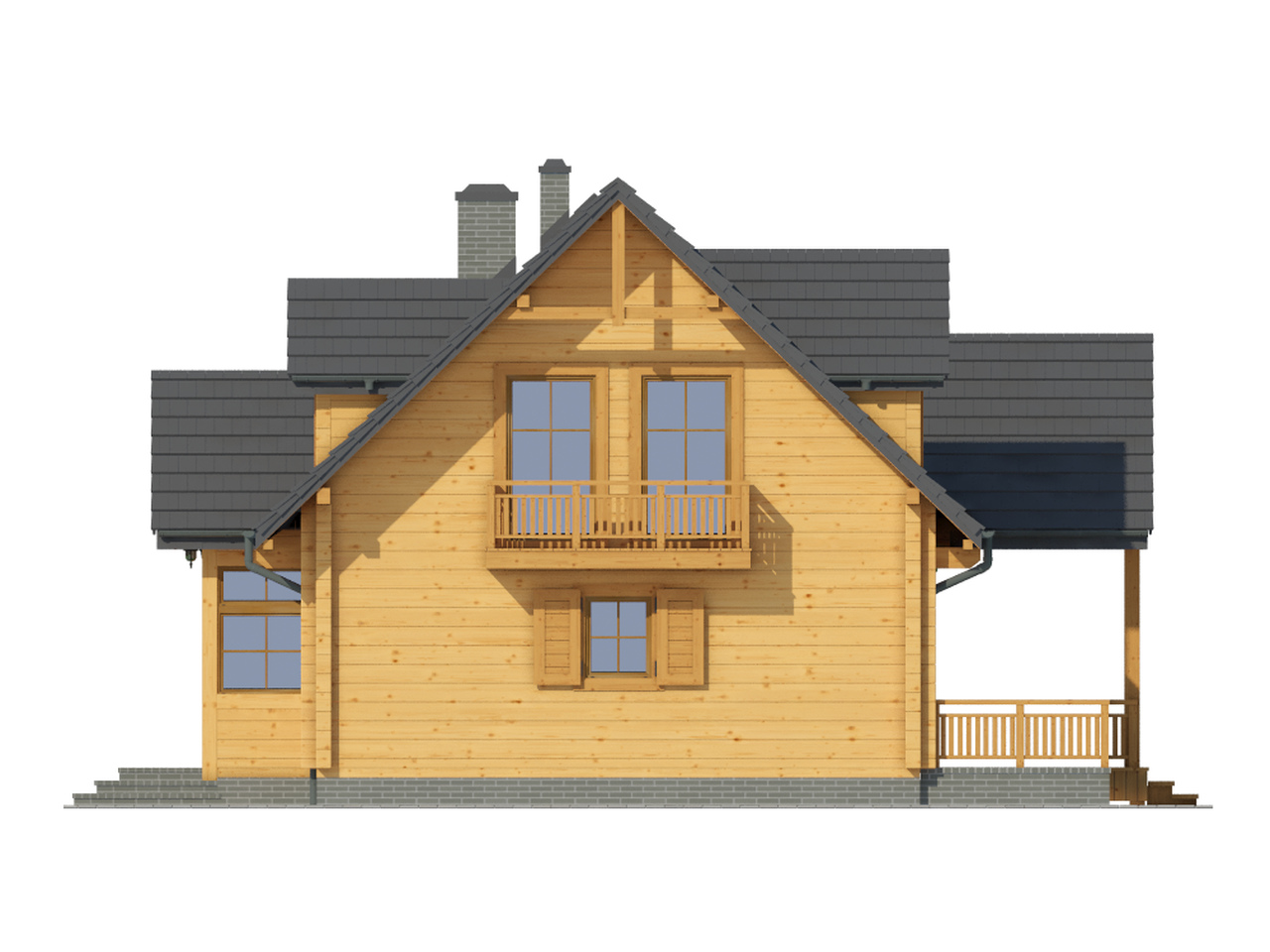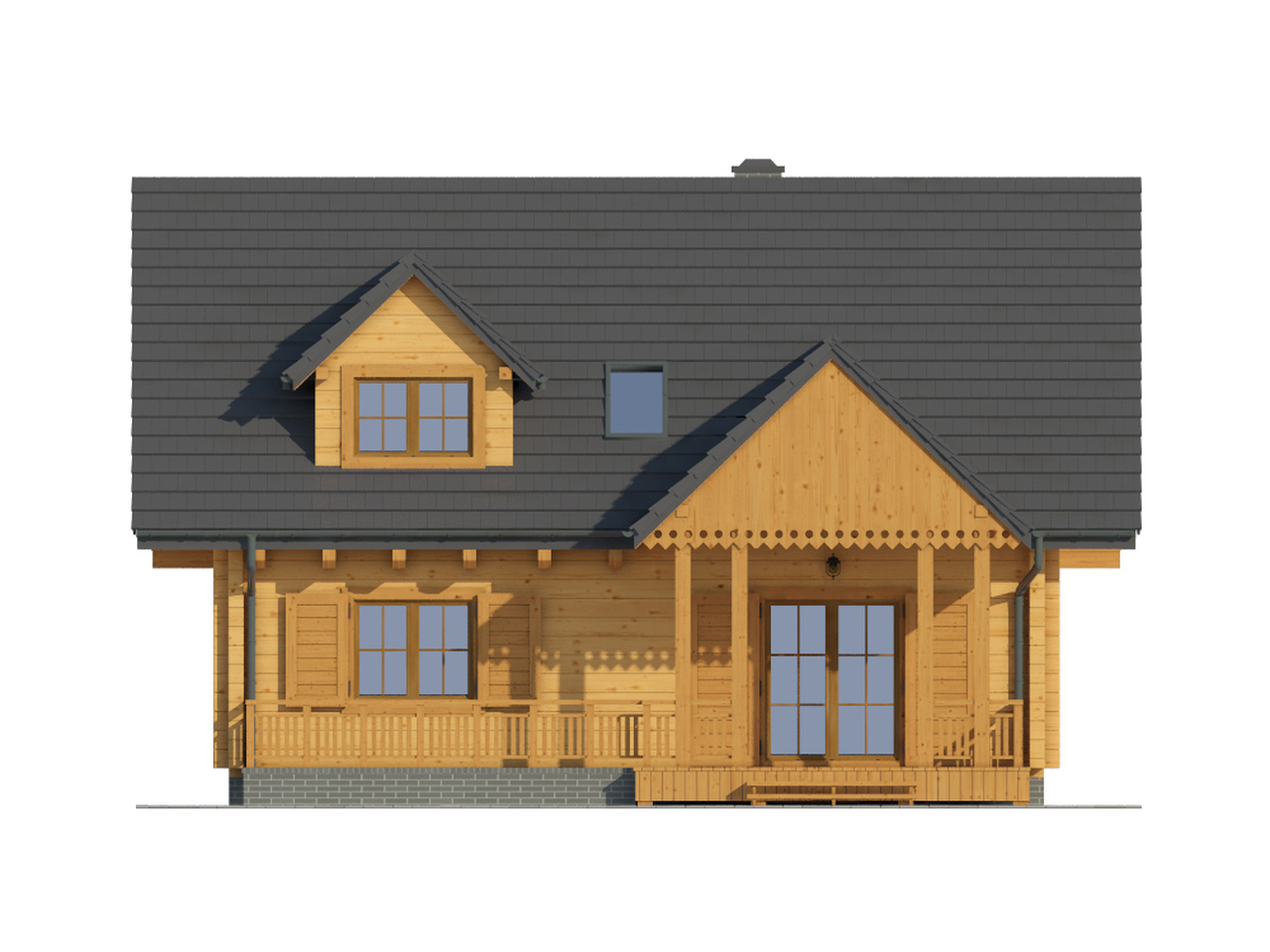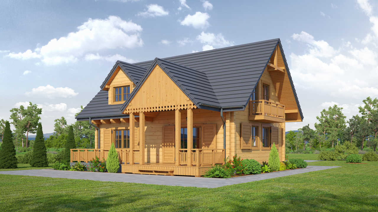 Dom z bali drewnianych. Duży salon z aneksem kuchennym, kominkiem, wyjściem na zadaszony taras i schodami na poddasze. Pokój, łazienka, kotłownia, wiatrołap i ganek. Na poddaszu trzy pokoje, łazienka i komunikacja. Duży pokój poddasza ma balkon. Architektura zewnętrzna domu nawiązuje do tradycji polskich domów drewnianych.