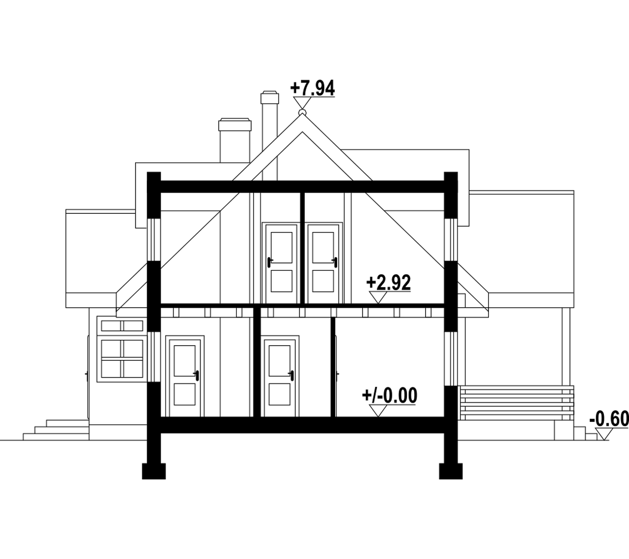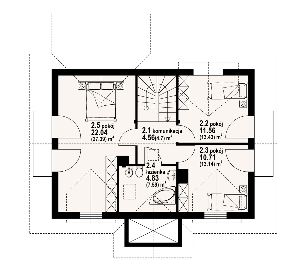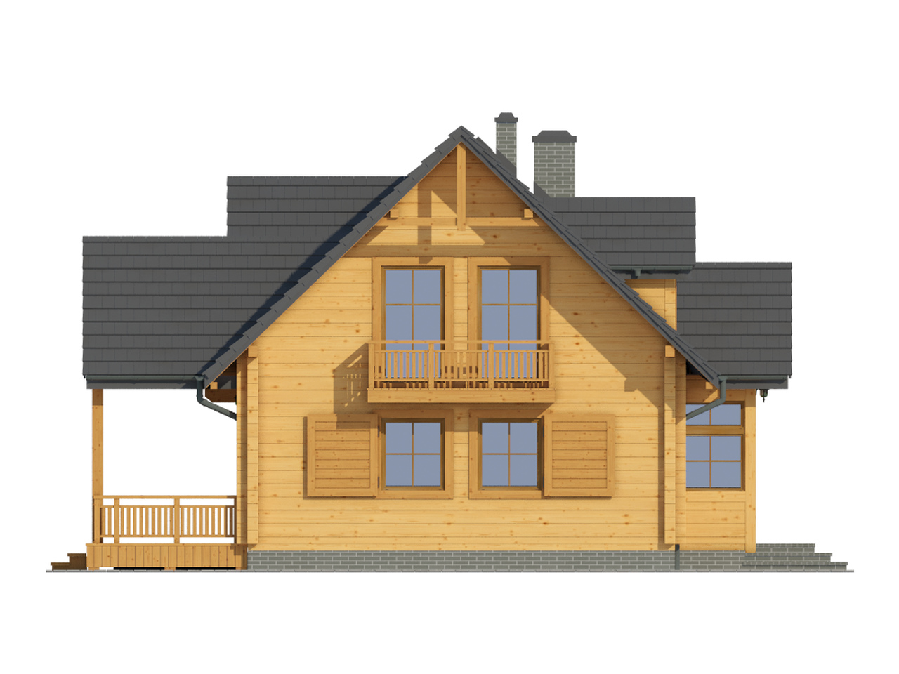 Dom z bali drewnianych. Duży salon z aneksem kuchennym, kominkiem, wyjściem na zadaszony taras i schodami na poddasze. Pokój, łazienka, kotłownia, wiatrołap i ganek. Na poddaszu trzy pokoje, łazienka i komunikacja. Duży pokój poddasza ma balkon. Architektura zewnętrzna domu nawiązuje do tradycji polskich domów drewnianych.
