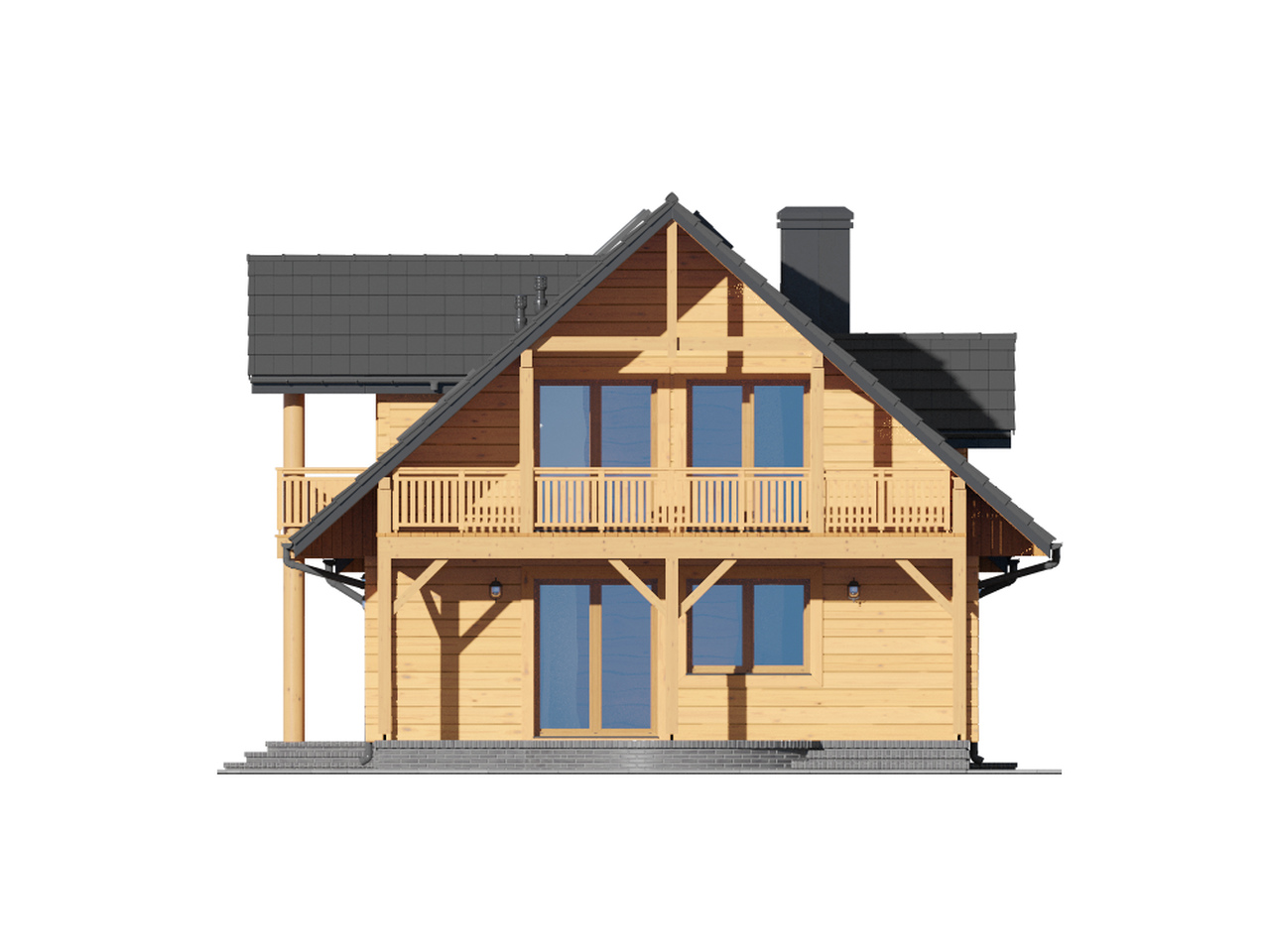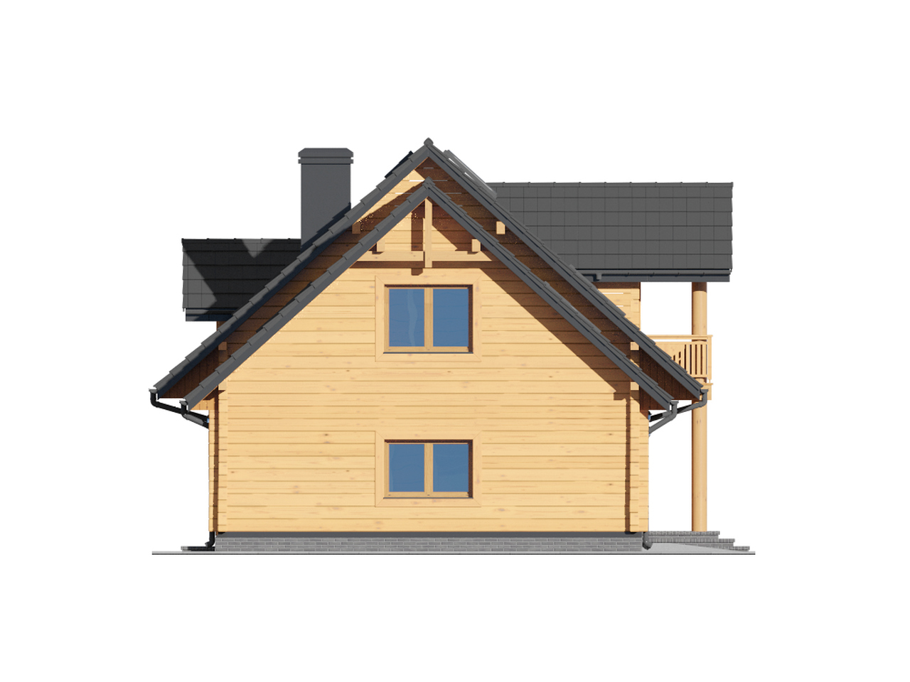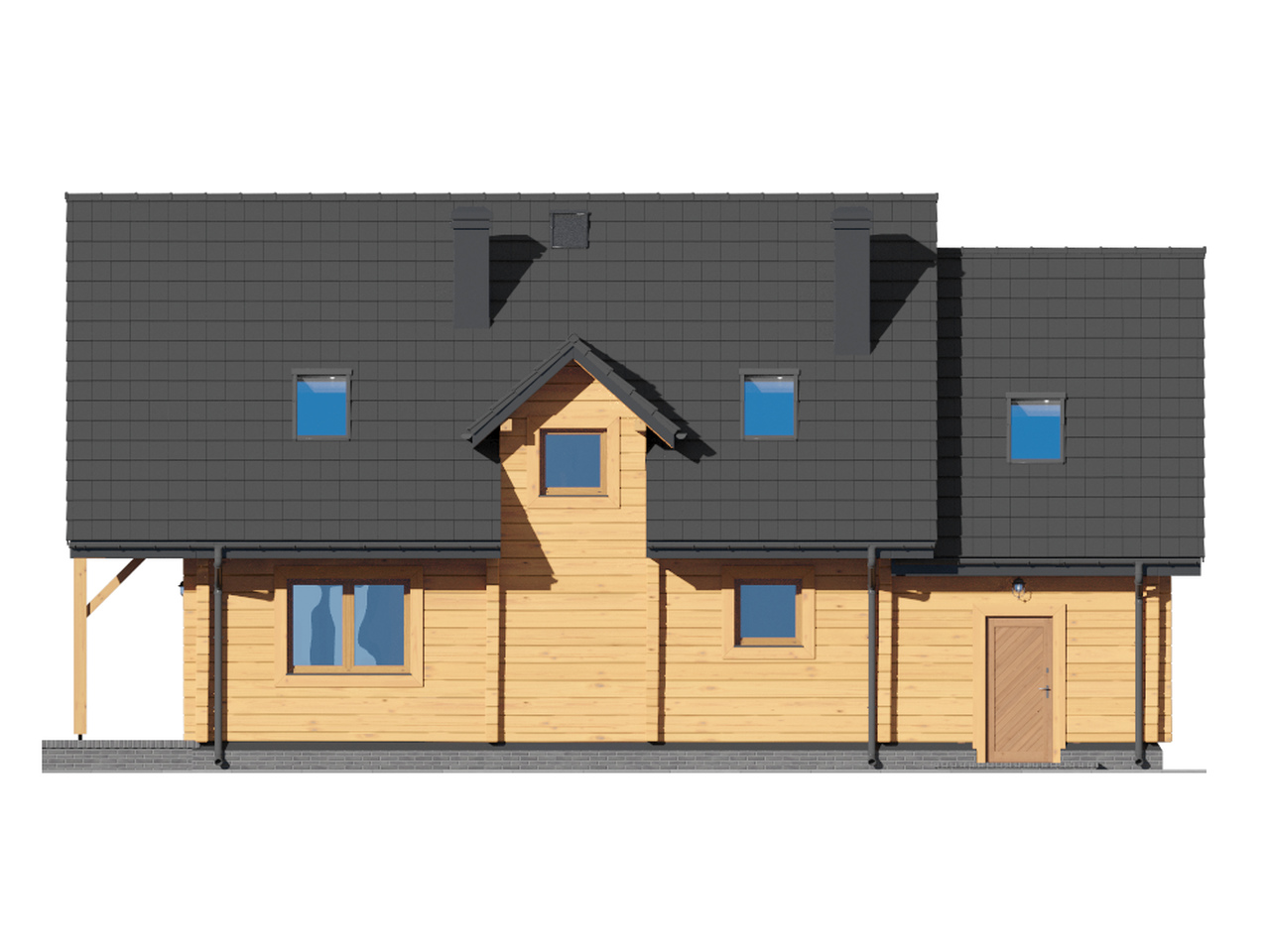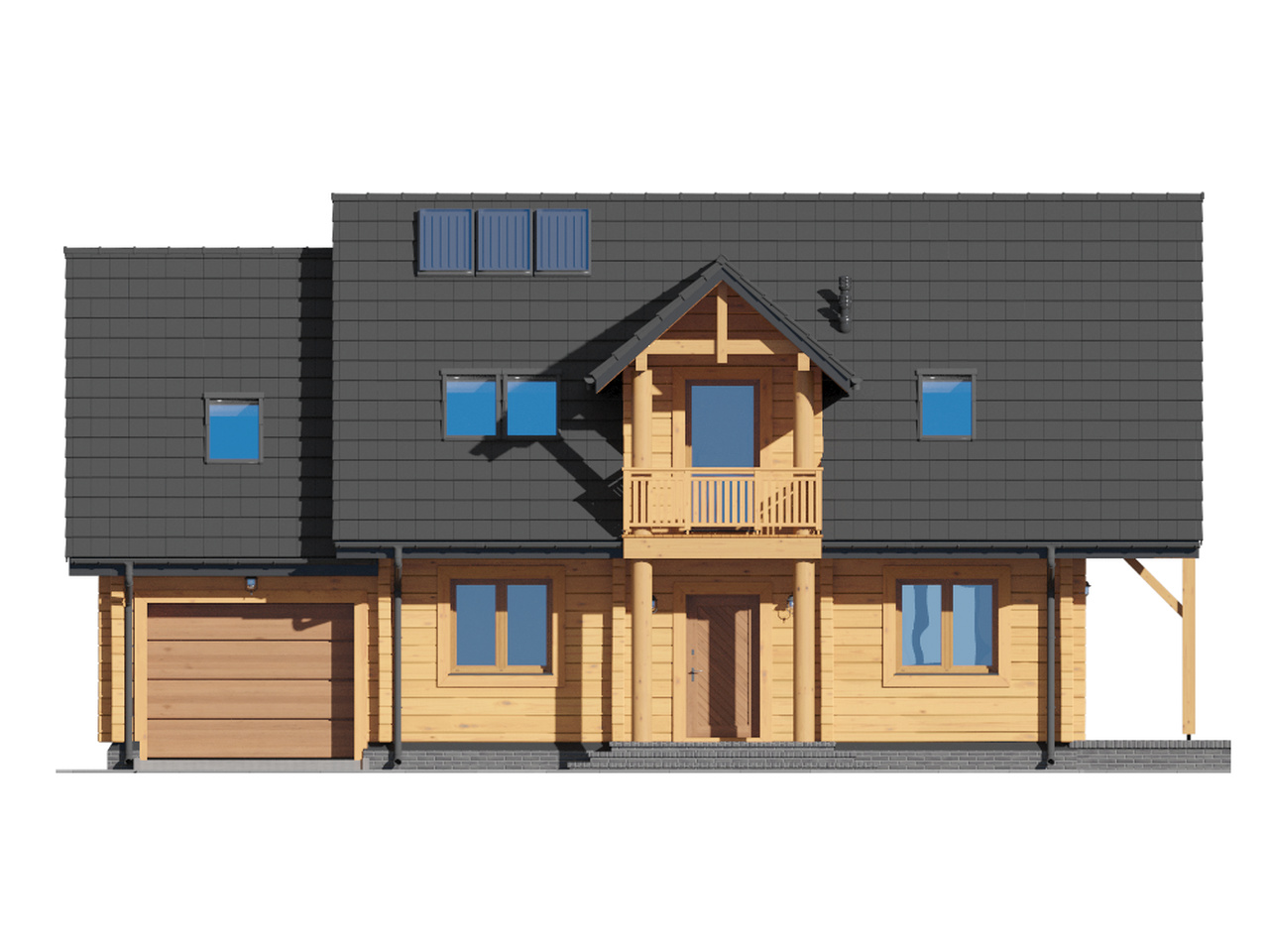 Dom z bali drewnianych. Sześć pokoi, dwie łazienki, aneks kuchenny, wiatrołap, kotłownia, garaż. Duży salon z aneksem kuchennym, kominkiem, schodami na poddasze i wyjściem na taras. Pięć pokoi na poddaszu (w tym trzy z balkonem). Instalacja solarna. Liczne warianty projektu.