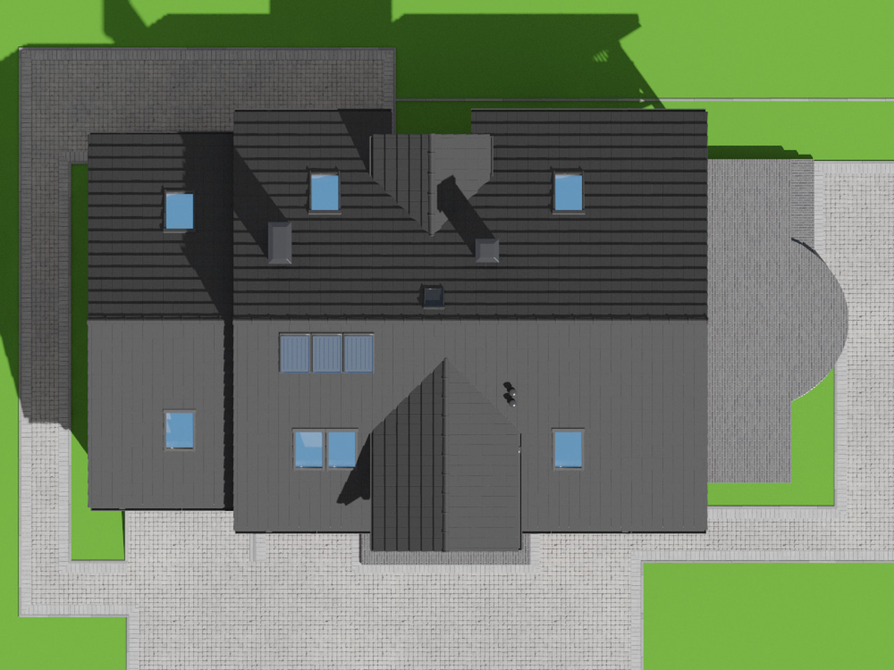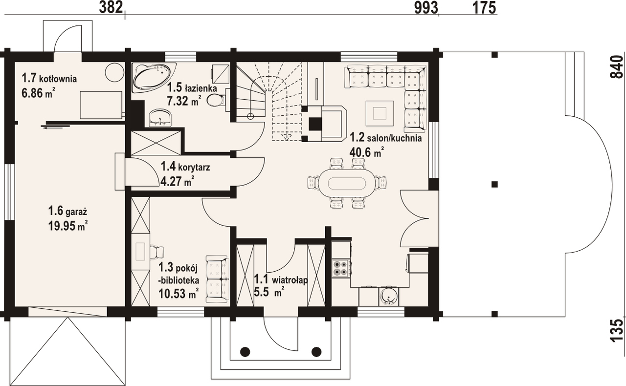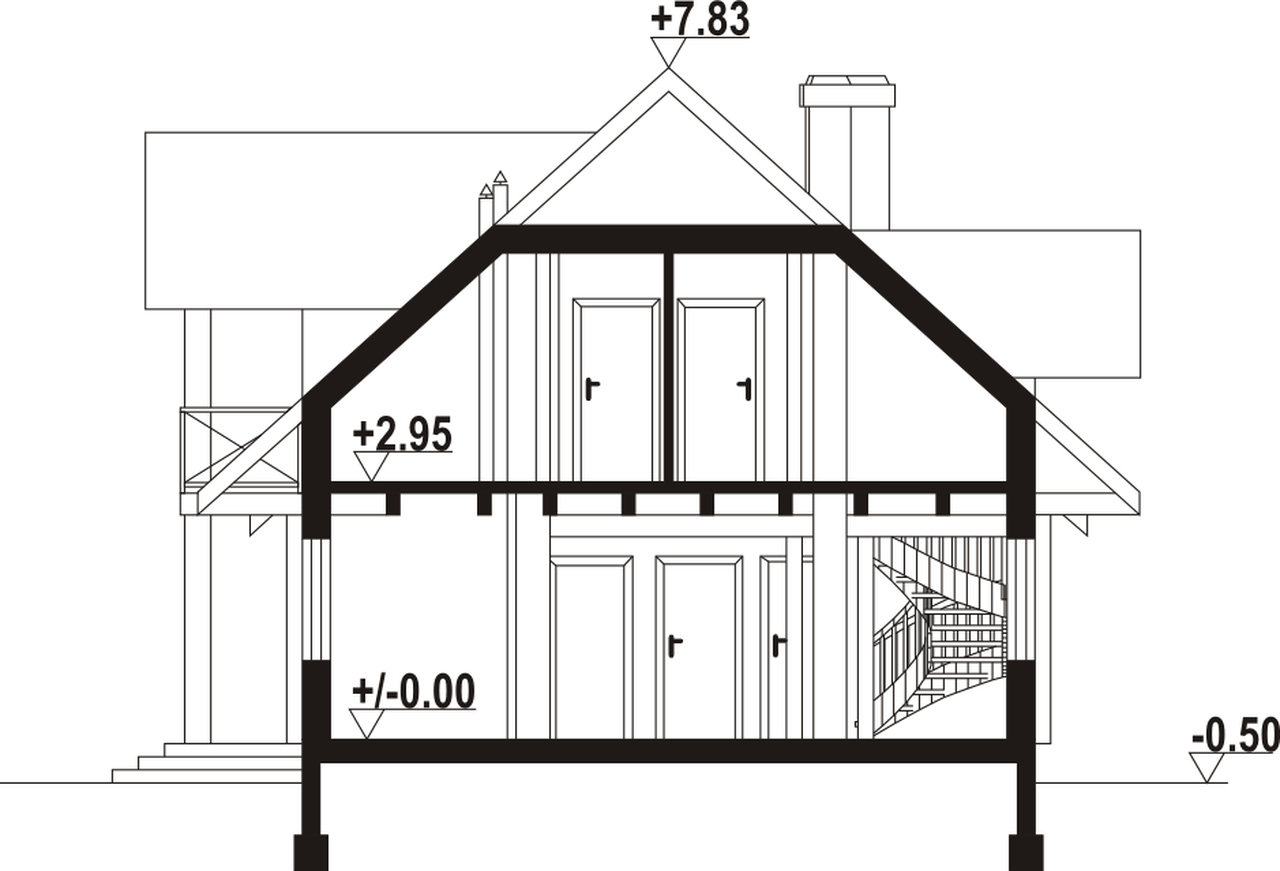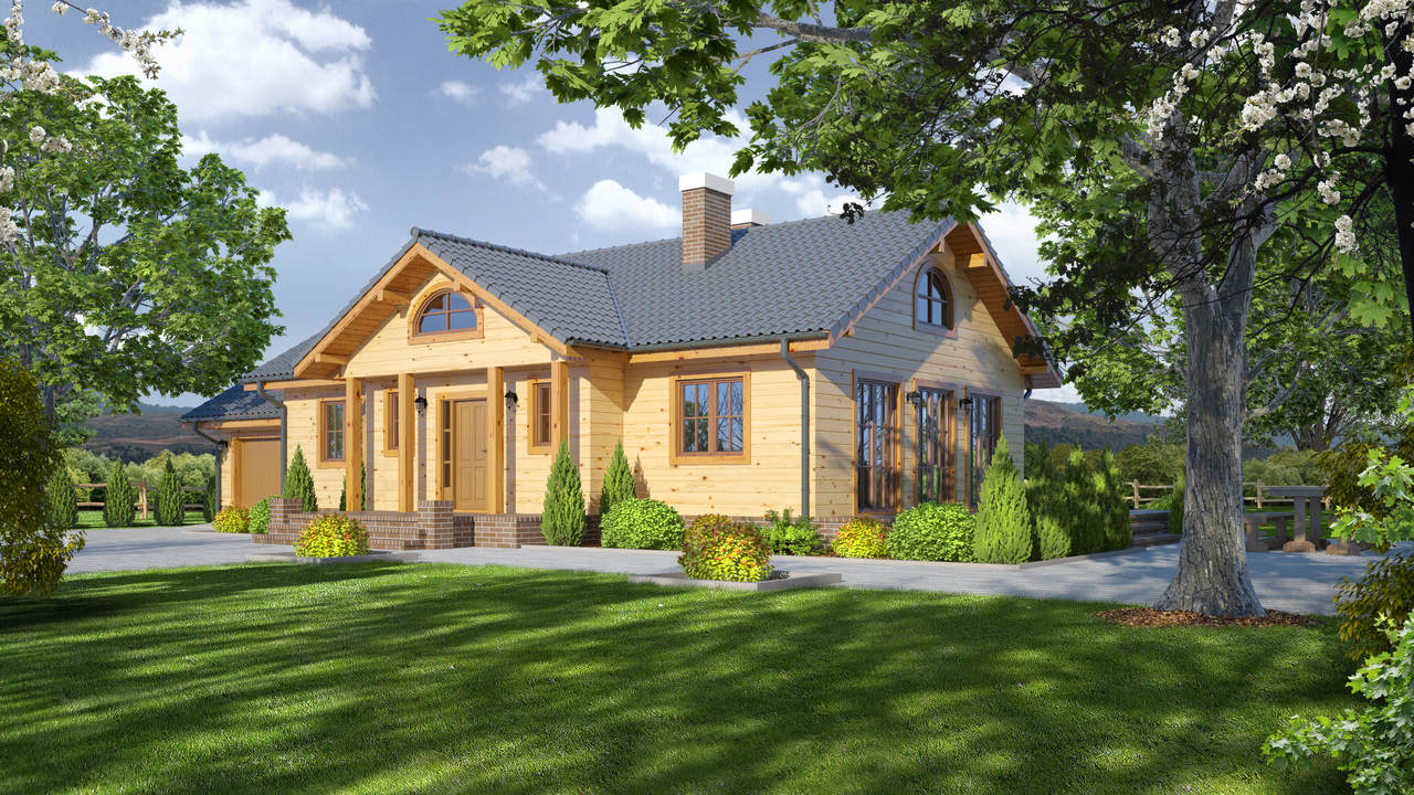 Dom z bali drewnianych. Sześć pokoi, dwie łazienki, aneks kuchenny, wiatrołap, kotłownia, garaż. Duży salon z aneksem kuchennym, kominkiem, schodami na poddasze i wyjściem na taras. Pięć pokoi na poddaszu (w tym trzy z balkonem). Instalacja solarna. Liczne warianty projektu.