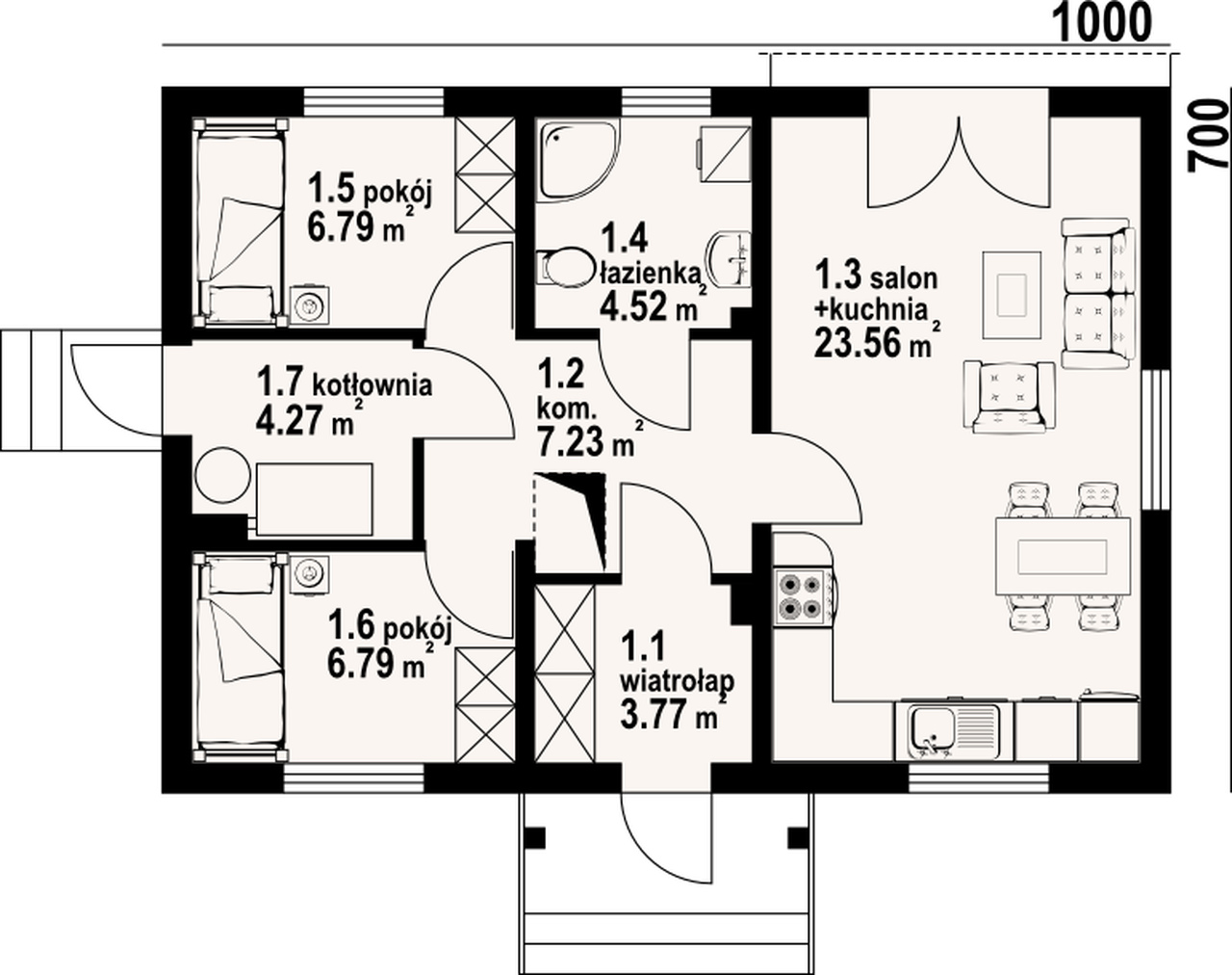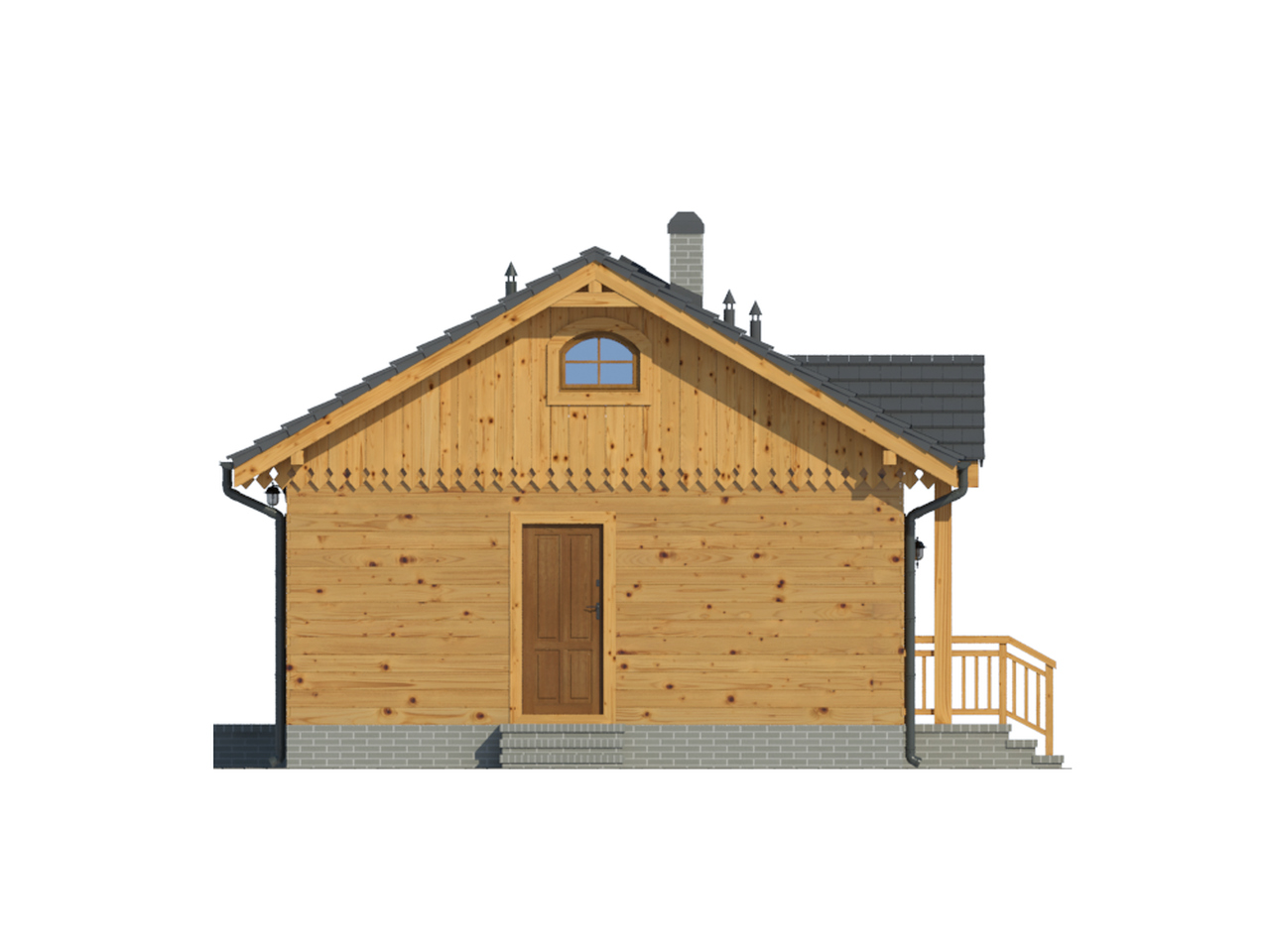 Dom w konstrukcji szkieletu drewnianego. Salon z aneksem kuchennym i wyjściem na taras. Dwa pokoje, łazienka, wiatrołap i kotłownia. Poddasze nieużytkowe. Wyjście na poddasze rozkładanymi schodami strychowymi. Zwarta bryła budynku i dach dwuspadowy sprzyjają szybkiej i taniej budowie i niskim kosztom eksploatacji.
