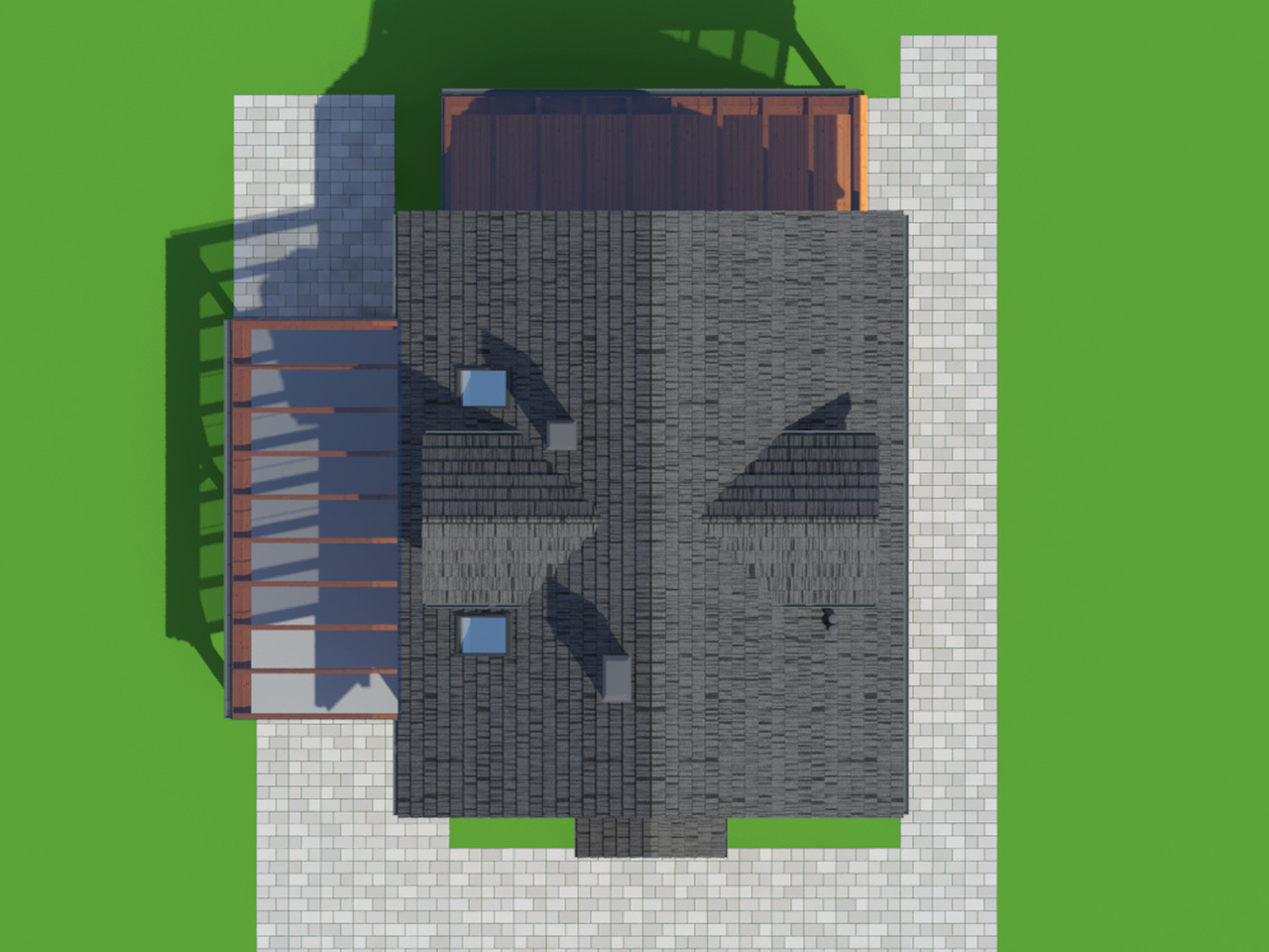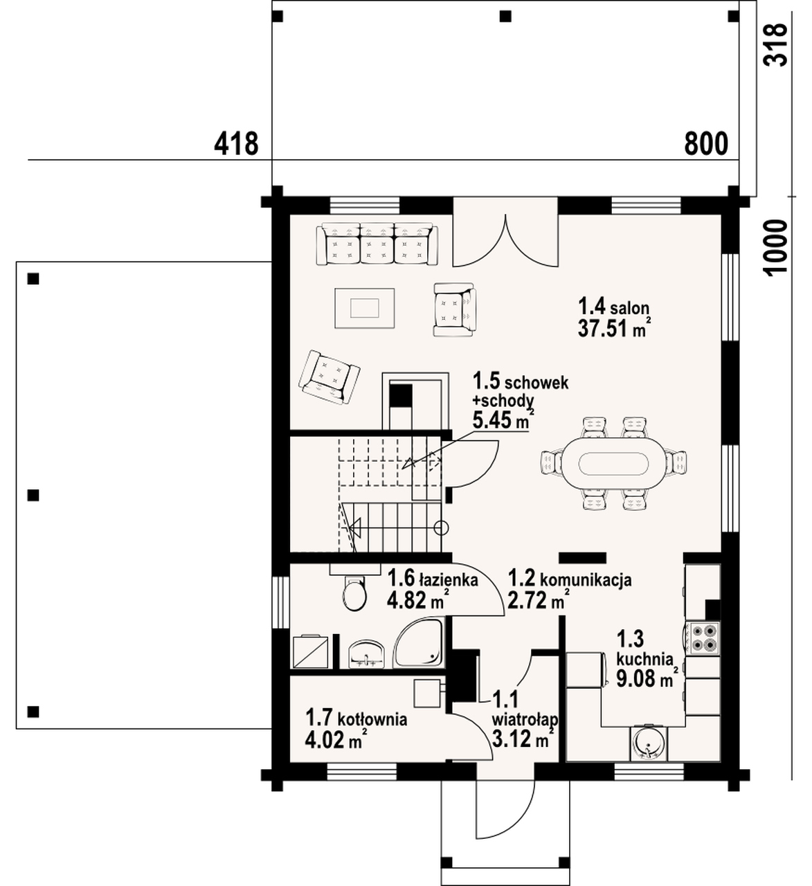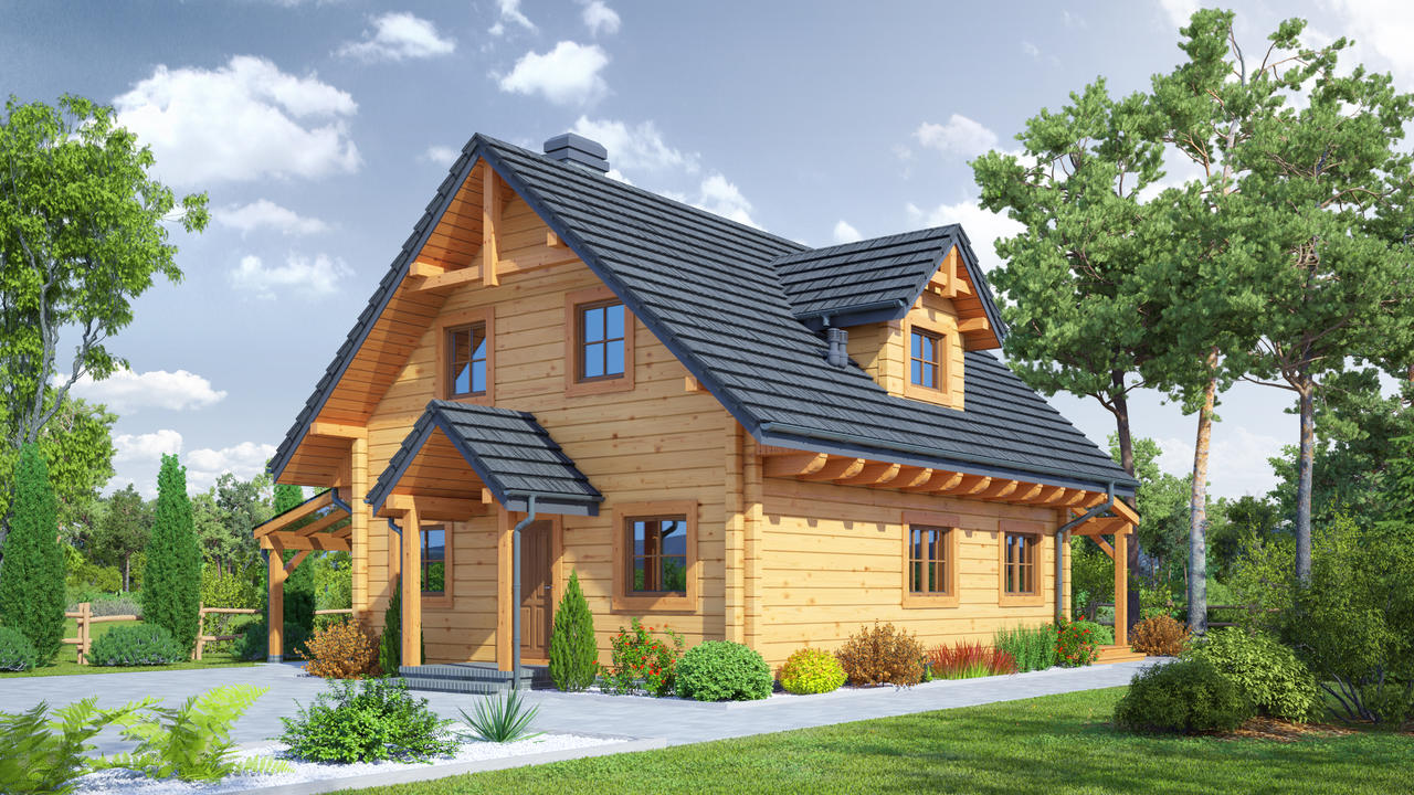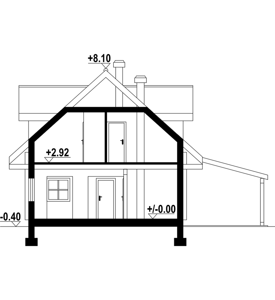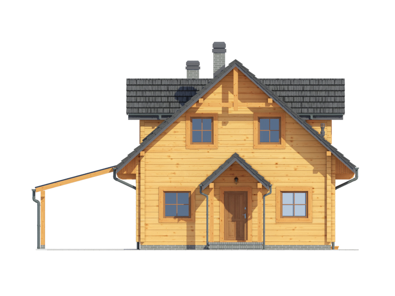 Dom z bali. Duży salon z kominkiem, wyjściem na zadaszony taras i przejściem do kuchni. Łazienka, wiatrołap, komunikacja, kotłownia i schowek. Wiata na samochód. Na poddaszu trzy pokoje, łazienka i komunikacja. Zwarta bryła budynku sprzyja szybkiej i taniej budowie i niskim kosztom eksploatacji.