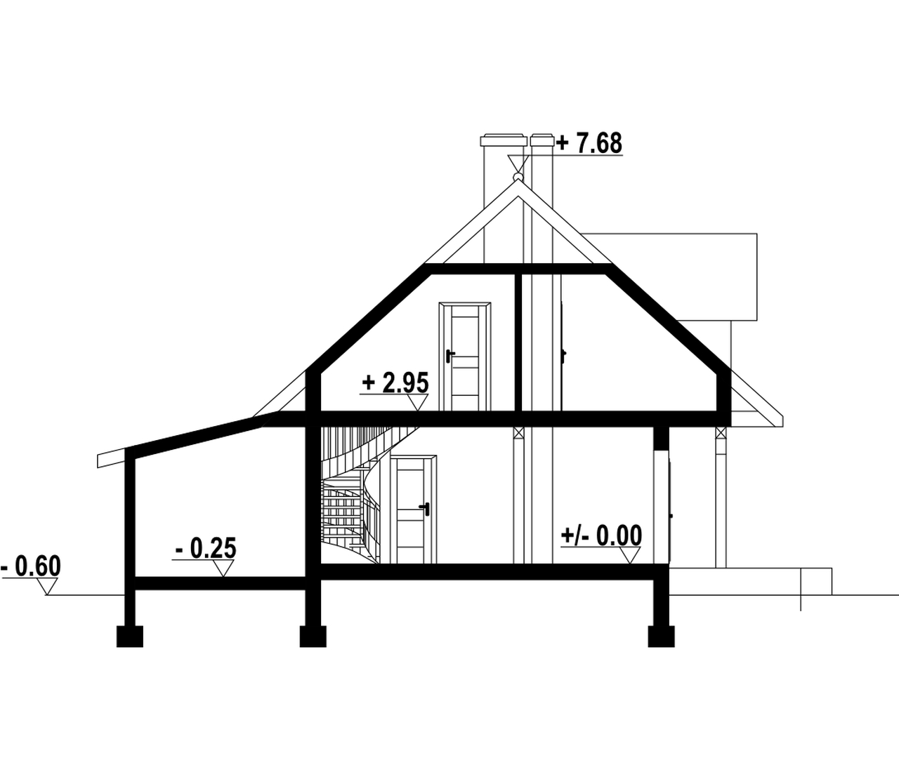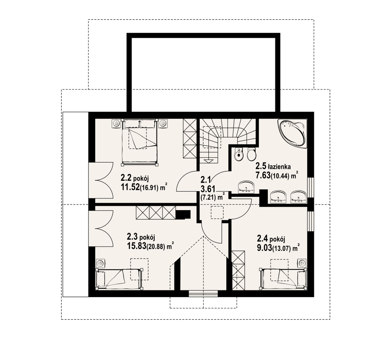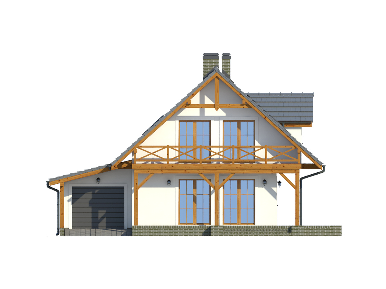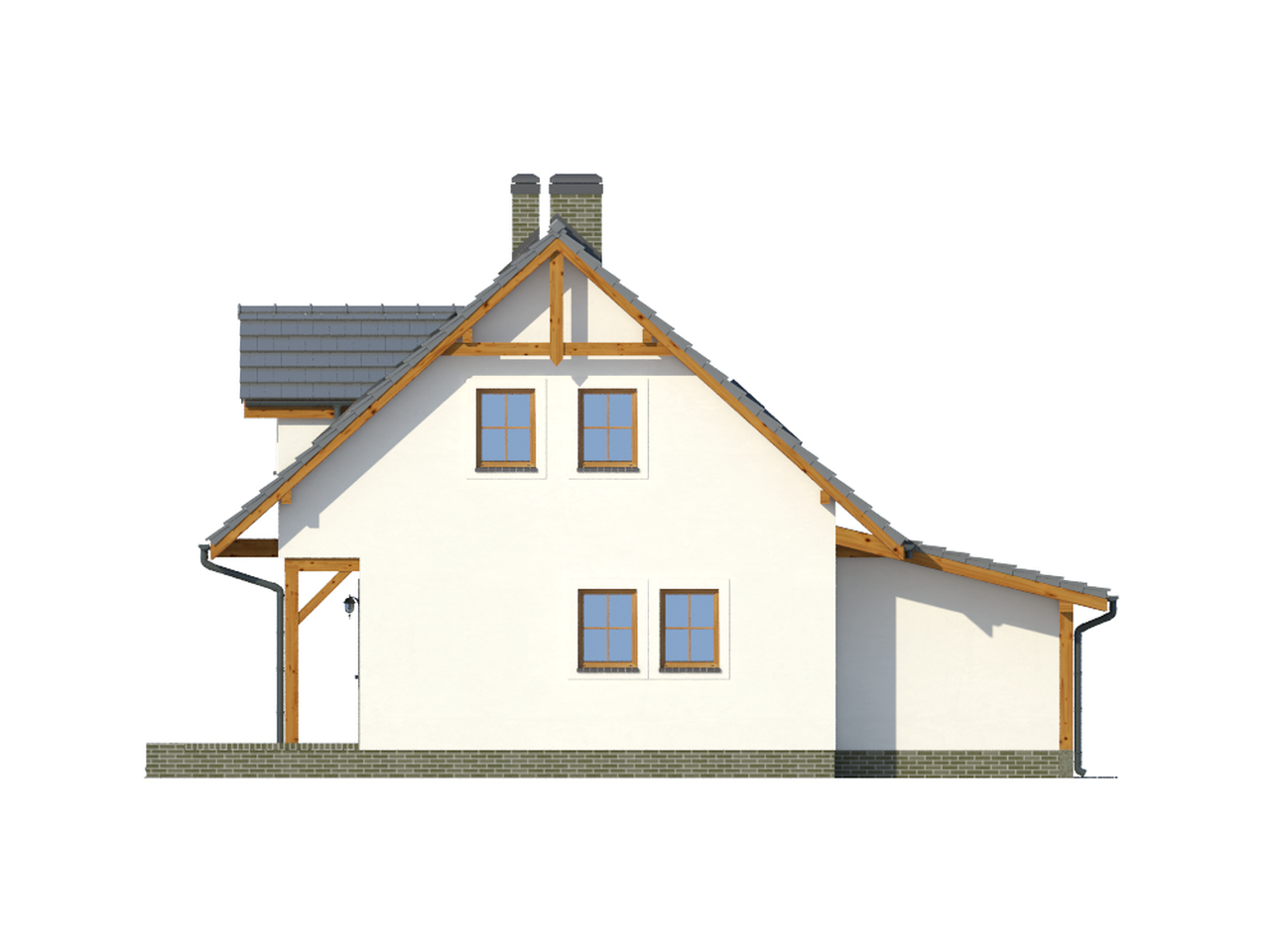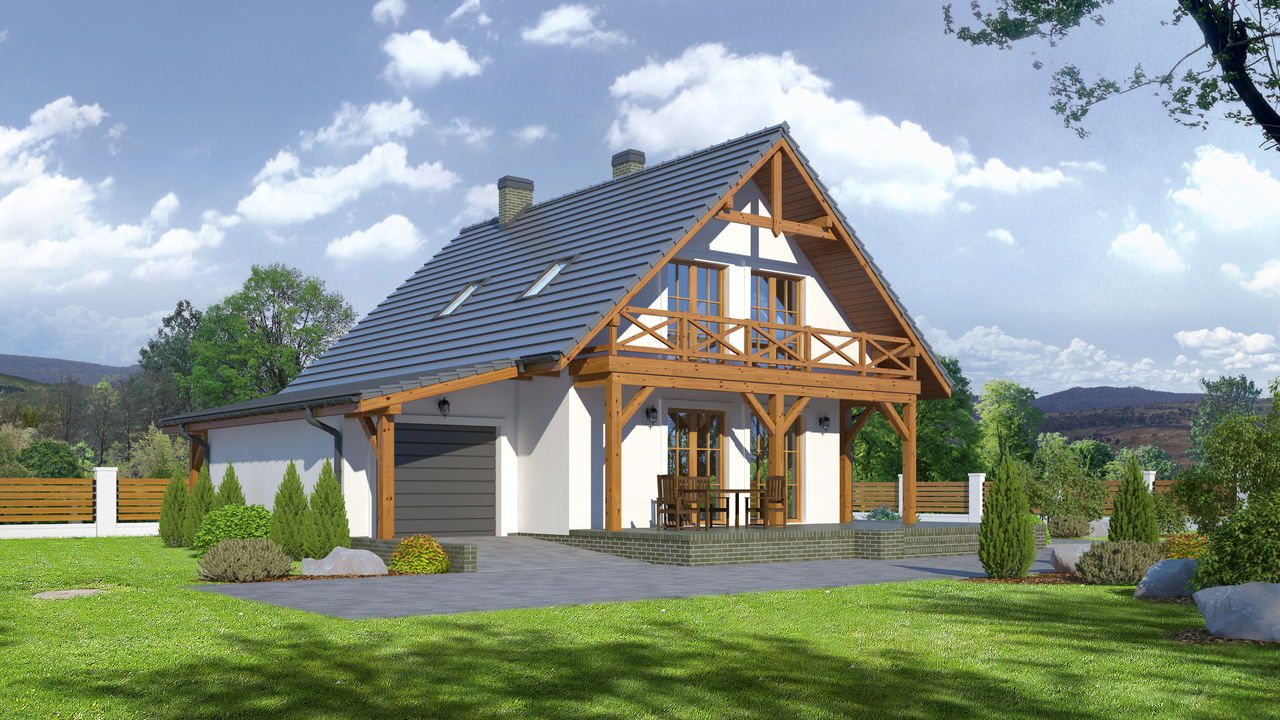 Funkcjonalny dom przeznaczony dla 3-4 osobowej rodziny. Strefa dzienna na parterze to salon z miejscem na jadalnię oraz aneks kuchenny. W salonie kominek i wyjście na częściowo zadaszony taras. Łazienka oraz dostępna z wiatrołapu kotłownia uzupełniają program parteru. W strefie nocnej na poddaszu znajdują się trzy sypialnie i łazienka. Do domu dobudowany został jednostanowiskowy garaż.