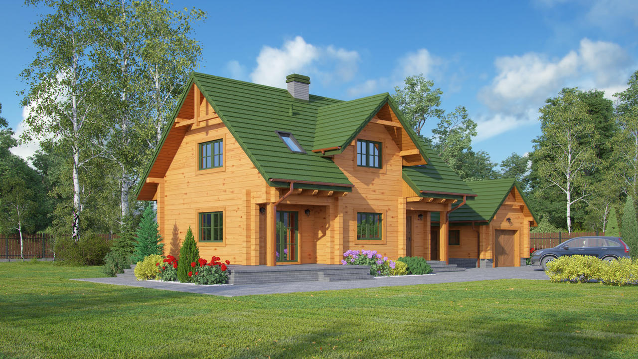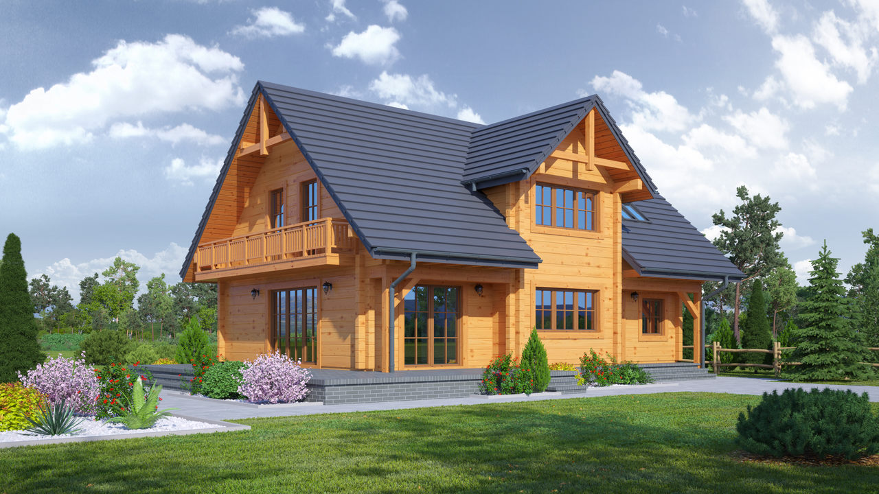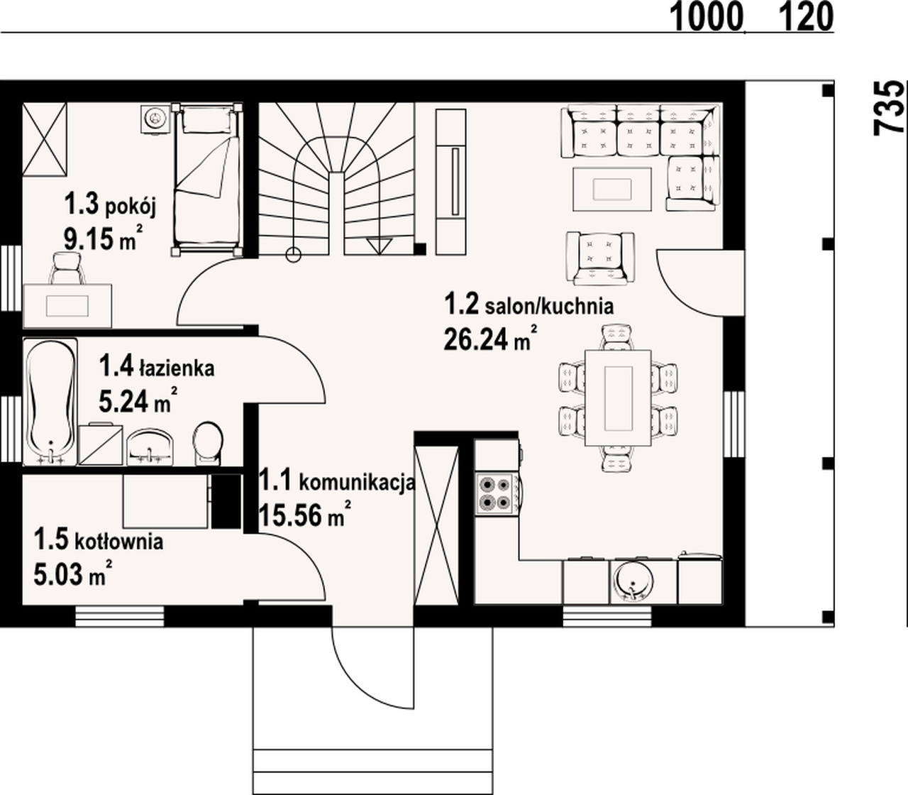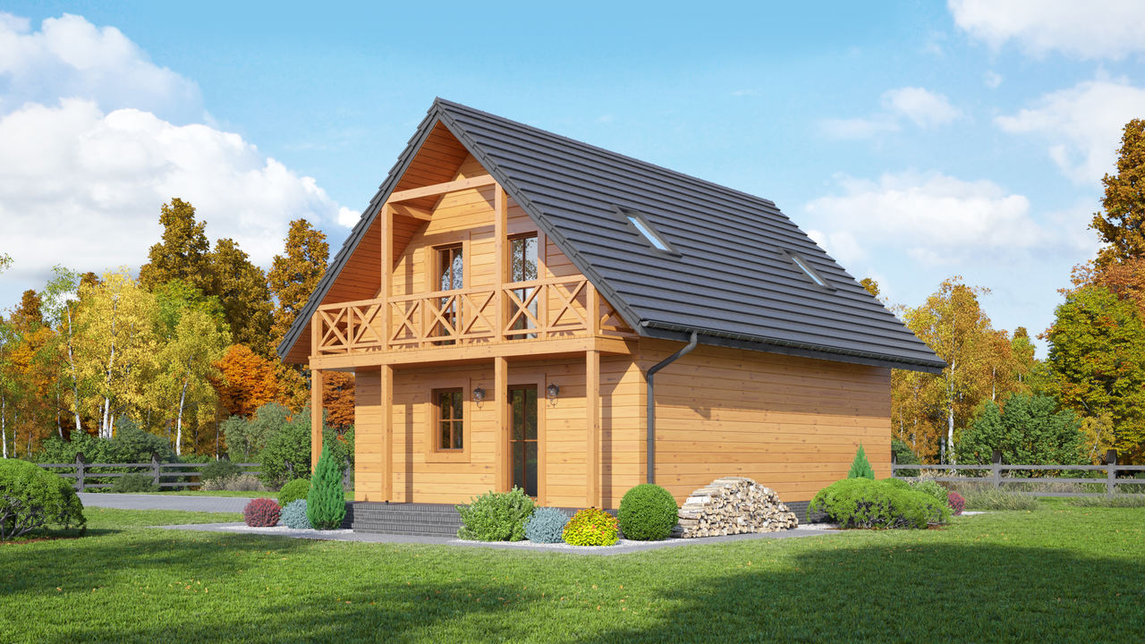 Dom w konstrukcji szkieletu drewnianego. Duży salon z aneksem kuchennym, wyjściem na zadaszony taras i schodami na poddasze, pokój, łazienka, kotłownia i komunikacja. Na poddaszu trzy pokoje, łazienka, komunikacja i balkon.Zwarta bryła budynku i dach dwuspadowy sprzyjają szybkiej i taniej budowie i niskim kosztom eksploatacji.