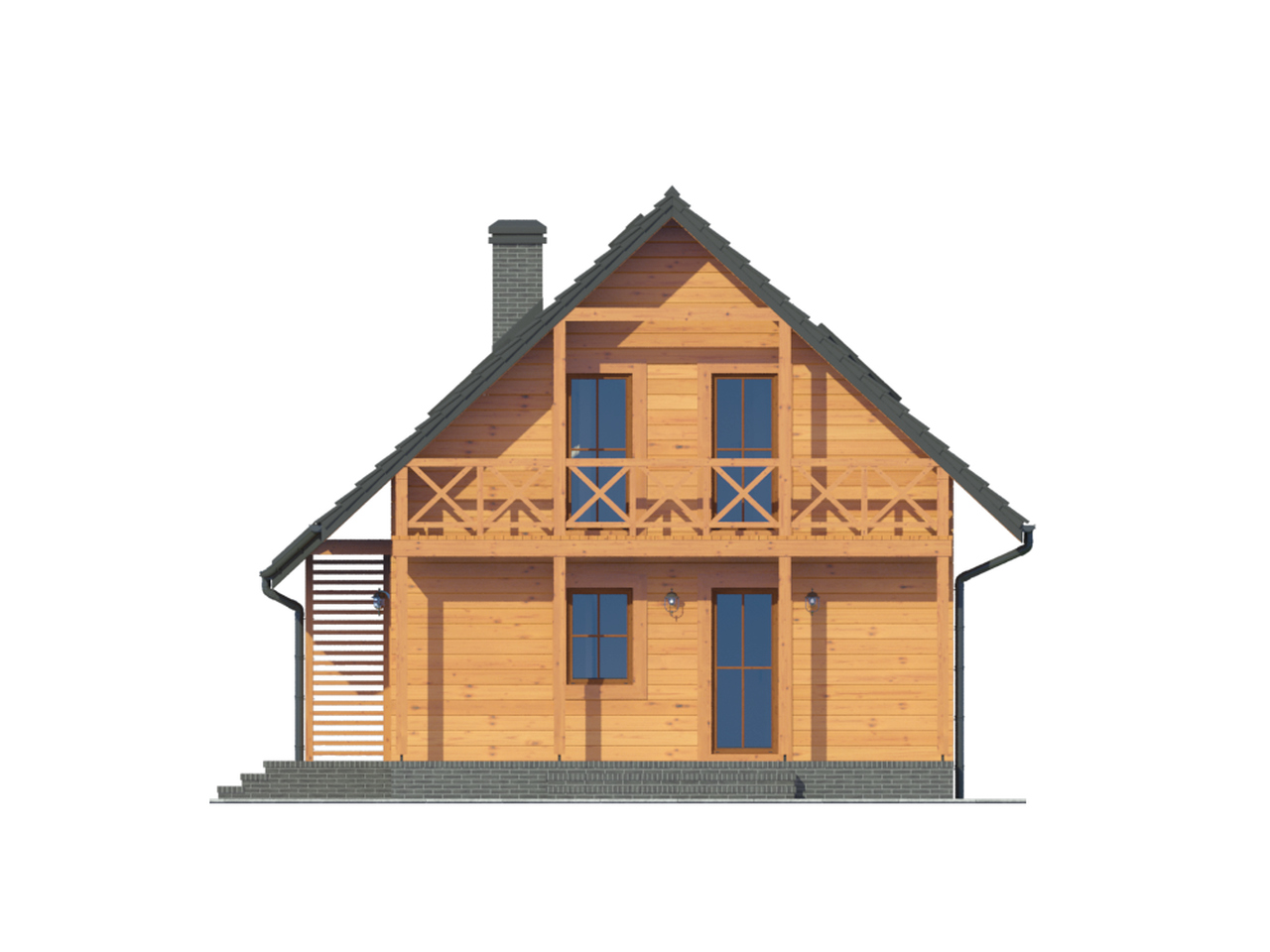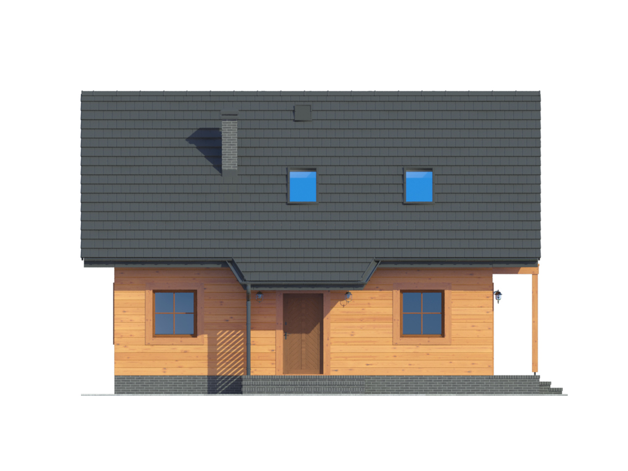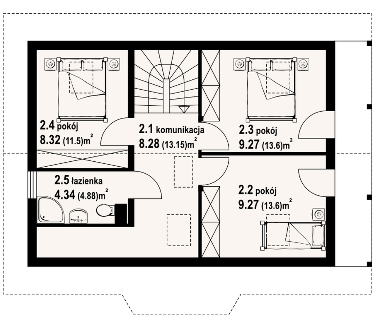 Dom w konstrukcji szkieletu drewnianego. Duży salon z aneksem kuchennym, wyjściem na zadaszony taras i schodami na poddasze, pokój, łazienka, kotłownia i komunikacja. Na poddaszu trzy pokoje, łazienka, komunikacja i balkon.Zwarta bryła budynku i dach dwuspadowy sprzyjają szybkiej i taniej budowie i niskim kosztom eksploatacji.