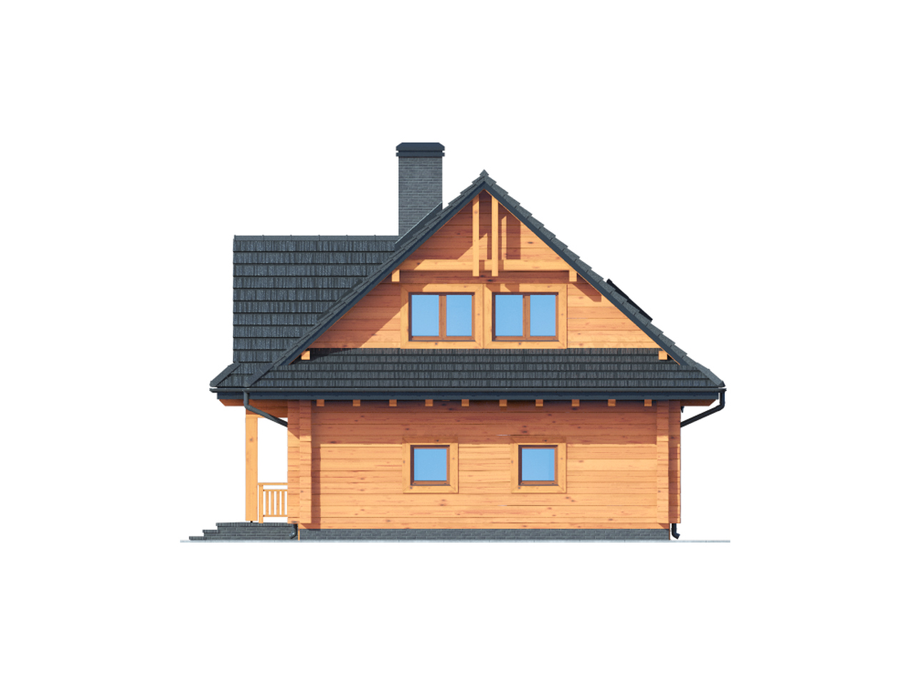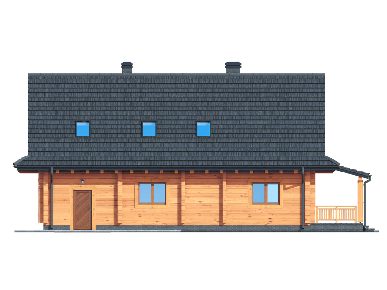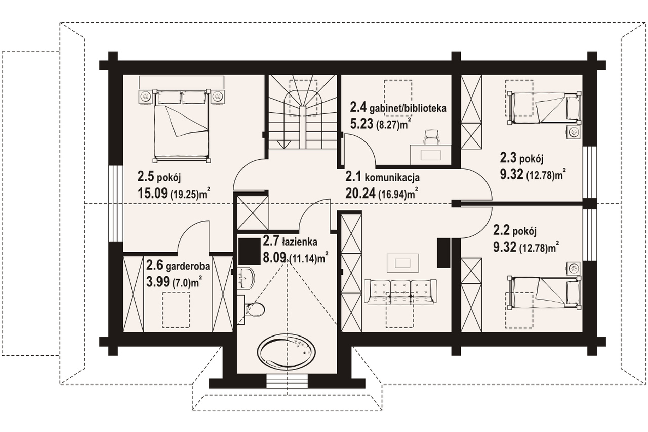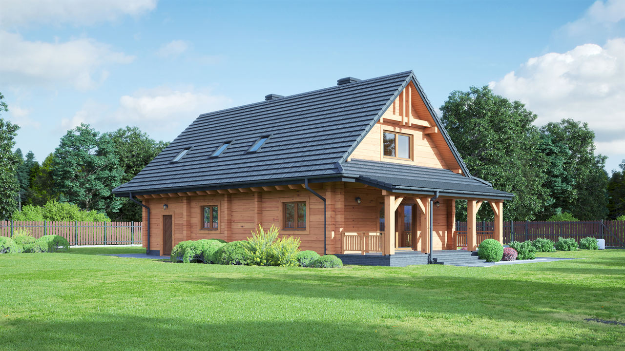 Dom z bali. Duży salon z aneksem kuchennym, kominkiem, wyjściem na duży zadaszony taras i schodami na poddasze. Pokój, łazienka, korytarz, kotłownia, schowek i garaż. Na poddaszu trzy pokoje, .łazienka, gabinet, komunikacja i garderoba.Zwarta bryła budynku i dach dwuspadowy sprzyjają szybkiej i taniej budowie i niskim kosztom eksploatacji