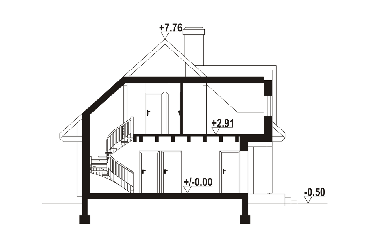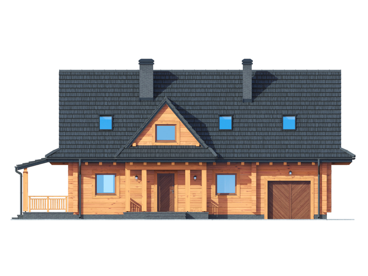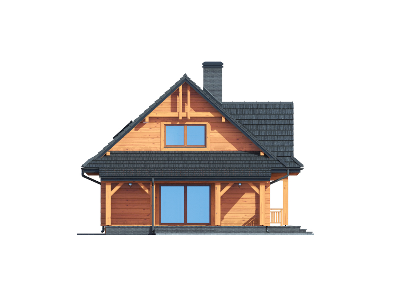 Dom z bali. Duży salon z aneksem kuchennym, kominkiem, wyjściem na duży zadaszony taras i schodami na poddasze. Pokój, łazienka, korytarz, kotłownia, schowek i garaż. Na poddaszu trzy pokoje, .łazienka, gabinet, komunikacja i garderoba.Zwarta bryła budynku i dach dwuspadowy sprzyjają szybkiej i taniej budowie i niskim kosztom eksploatacji