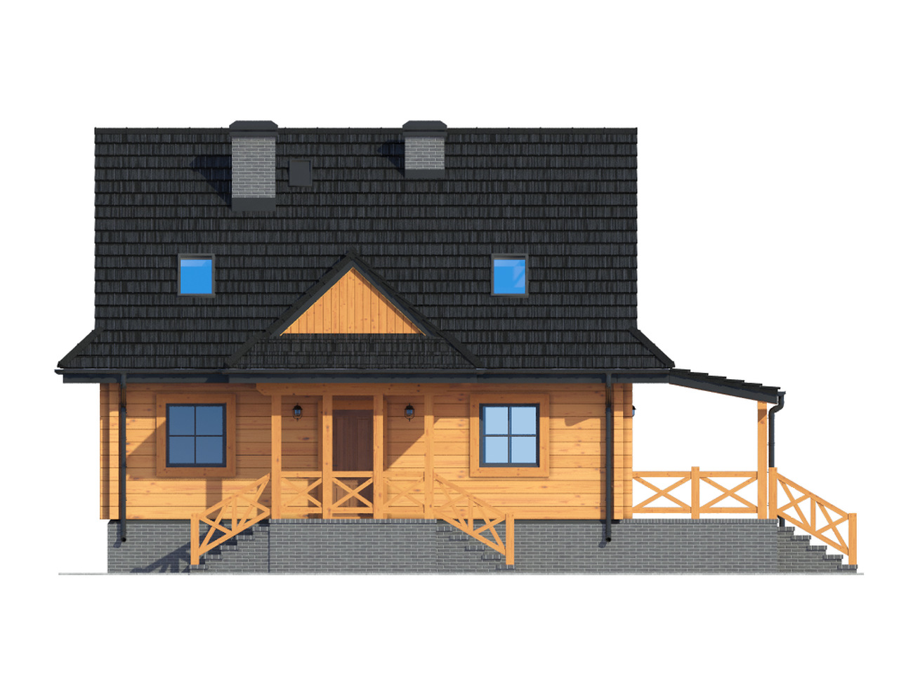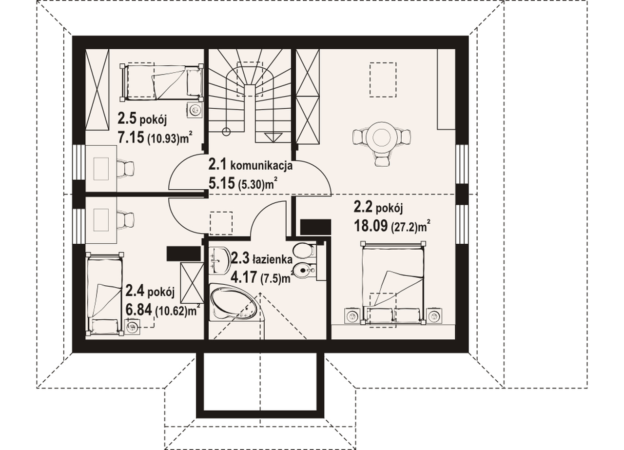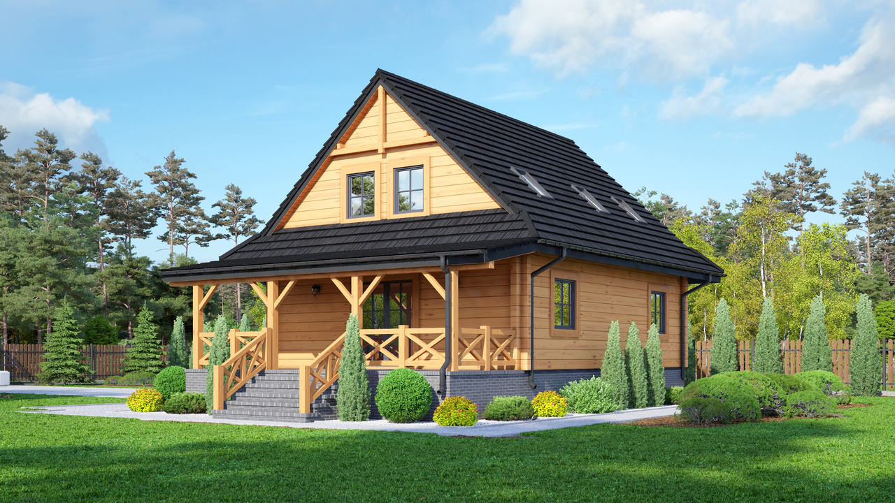 Dom z bali drewnianych. Podpiwniczony. Duży salon z aneksem kuchennym, kominkiem, wyjściem na zadaszony taras i schodami. Pokój, wiatrołap, łazienka, garderoba. Na poddaszu trzy pokoje, łazienka i komunikacja. Zwarta bryła budynku i dach dwuspadowy sprzyjają szybkiej i taniej budowie i niskim kosztom eksploatacji.