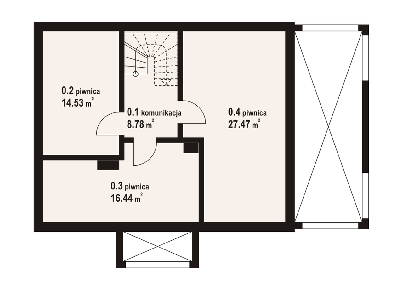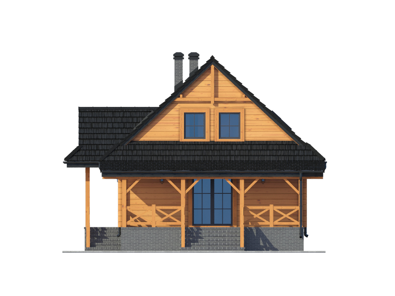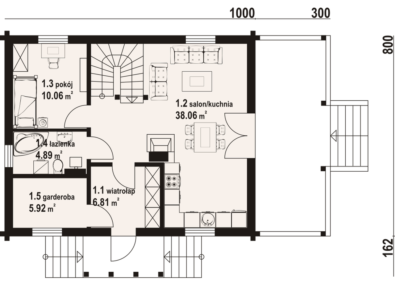 Dom z bali drewnianych. Podpiwniczony. Duży salon z aneksem kuchennym, kominkiem, wyjściem na zadaszony taras i schodami. Pokój, wiatrołap, łazienka, garderoba. Na poddaszu trzy pokoje, łazienka i komunikacja. Zwarta bryła budynku i dach dwuspadowy sprzyjają szybkiej i taniej budowie i niskim kosztom eksploatacji.